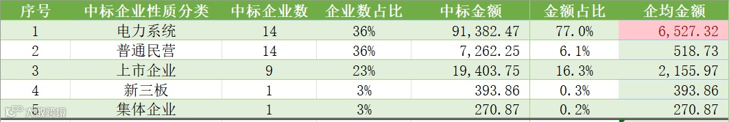 从中标企业数量看,电力系统和普通民营企业最多,都有14家,分别占比约36%。