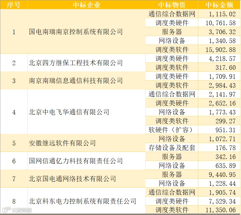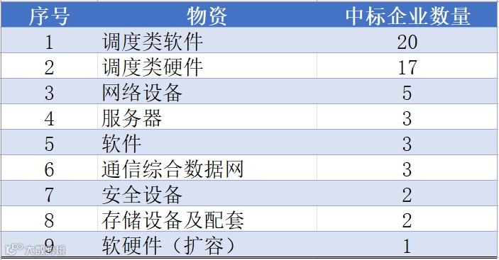 根据最终中标结果,调度类硬件、调度类软件、服务器等3类物资标段在本项目的投资金额超过1亿元,这3类物资投资金额占本次项目投资总金额的85.6%。