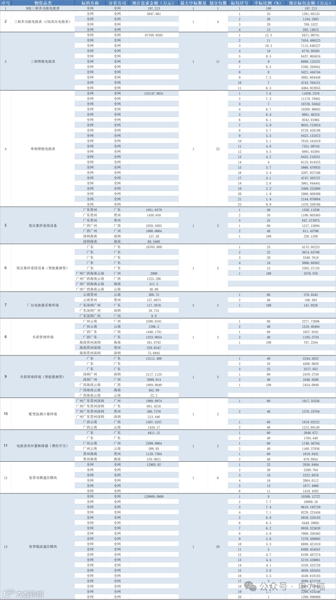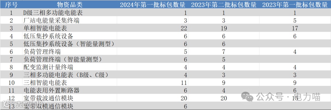 本次招标主要需求包含13个品类、24个标的、100个标包。本次招标新增一个物资品类:宽带载波通信模块。