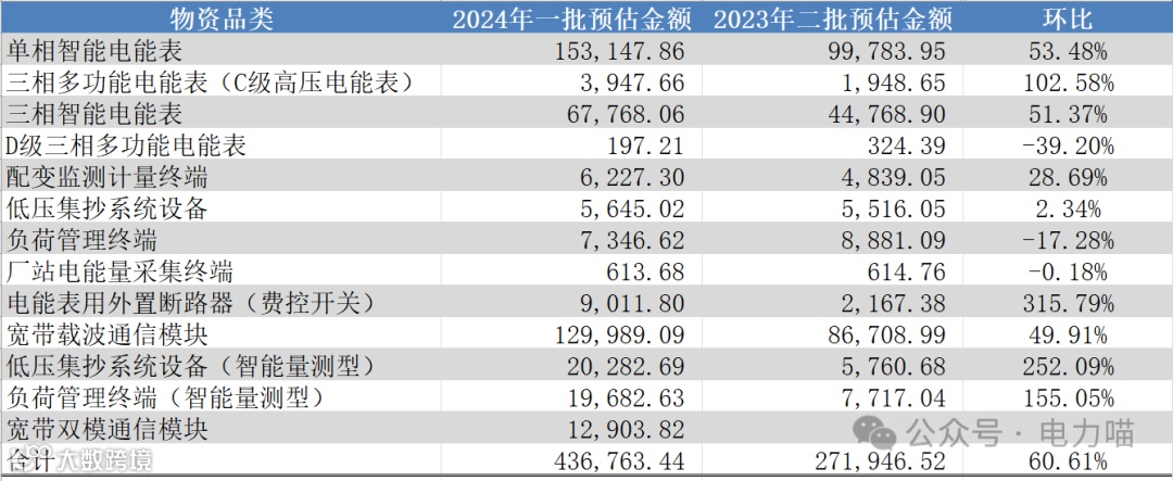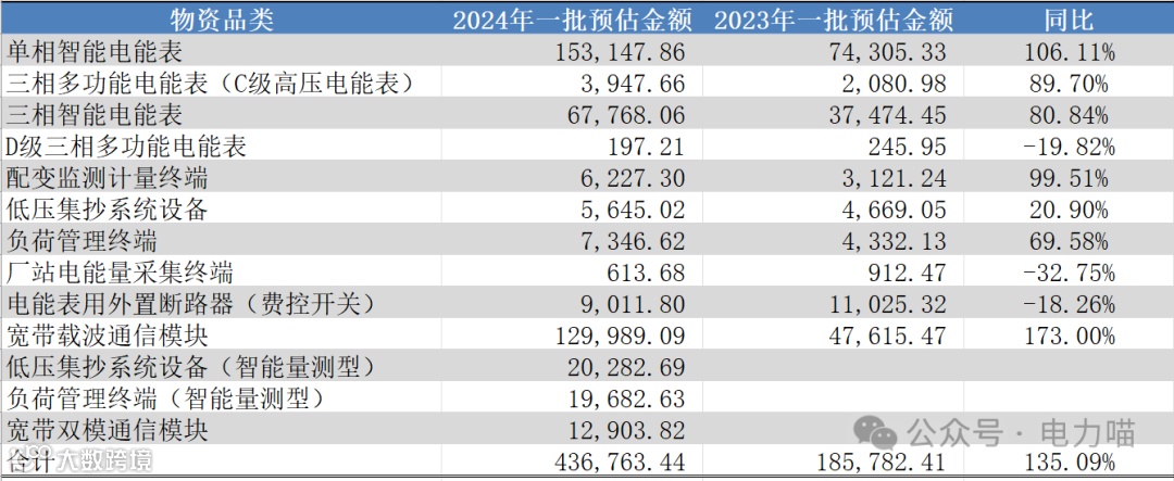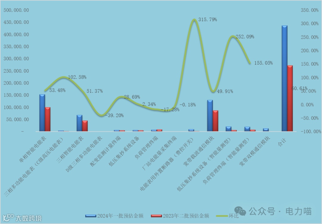 根据智能电表和计量自动化终端的分包情况,中标企业理论最大中标金额可达到37,088.23万元,占比约为13%。从理论中标金额来看,本次招标比2023年第二批的理论最大中标金额大幅增加约13,884万元;从占比来看,本次招标比2023年第二批理论最大中标金额占比增加约0.1个百分点。