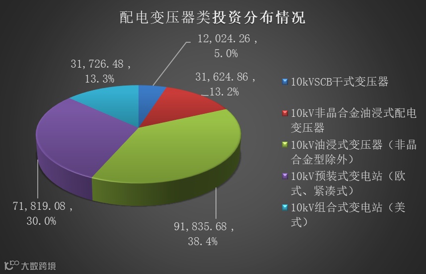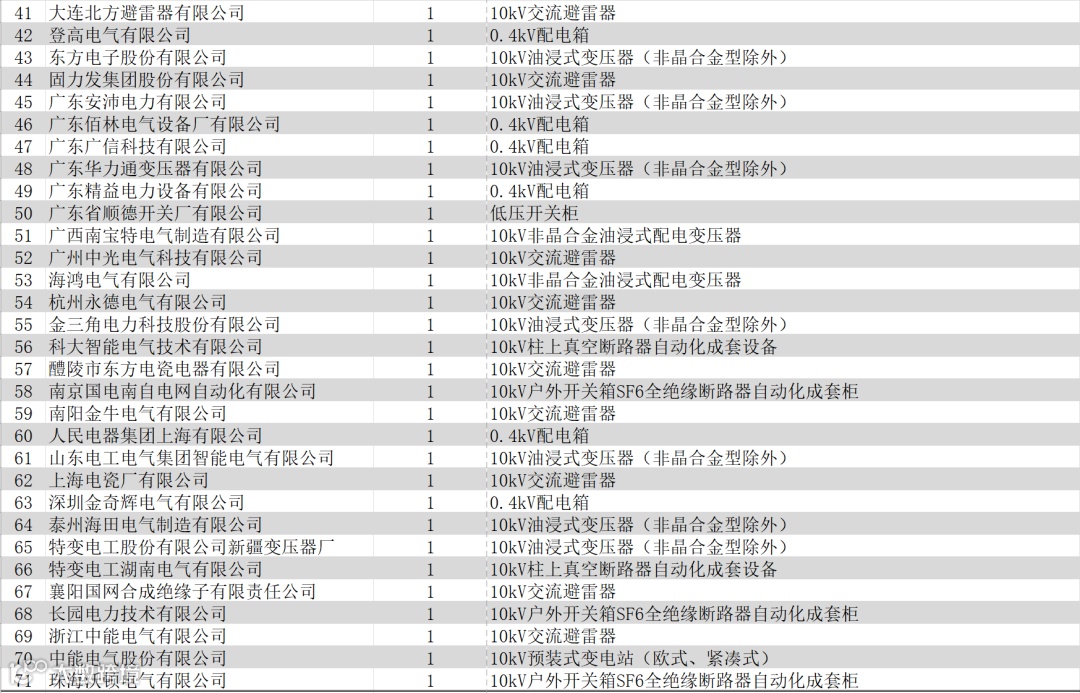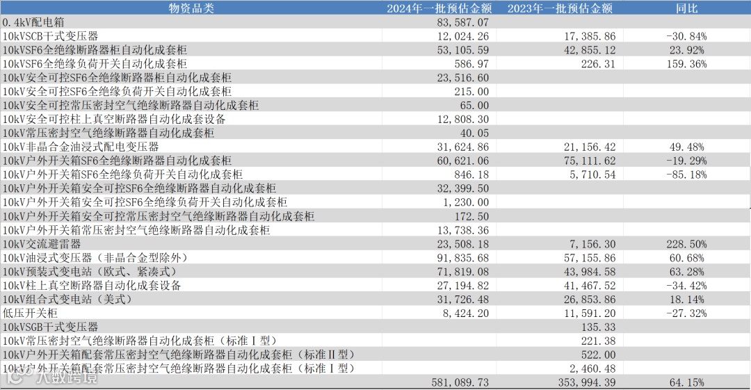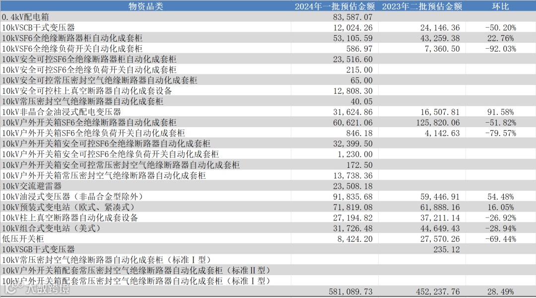 具体到各物资品类,除新增的10个品类外,本次招标共有7个品类的投资金额同比明显增长,即:10kVSF6全绝缘断路器柜自动化成套柜、10kVSF6全绝缘负荷开关自动化成套柜、10kV非晶合金油浸式配电变压器、10kV交流避雷器、10kV油浸式变压器(非晶合金型除外)、10kV预装式变电站(欧式、紧凑式)10kV组合式变电站(美式);另外9个品类环比下降。