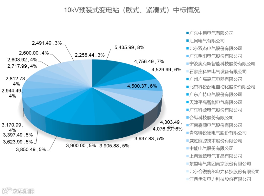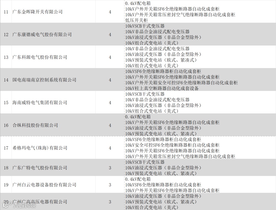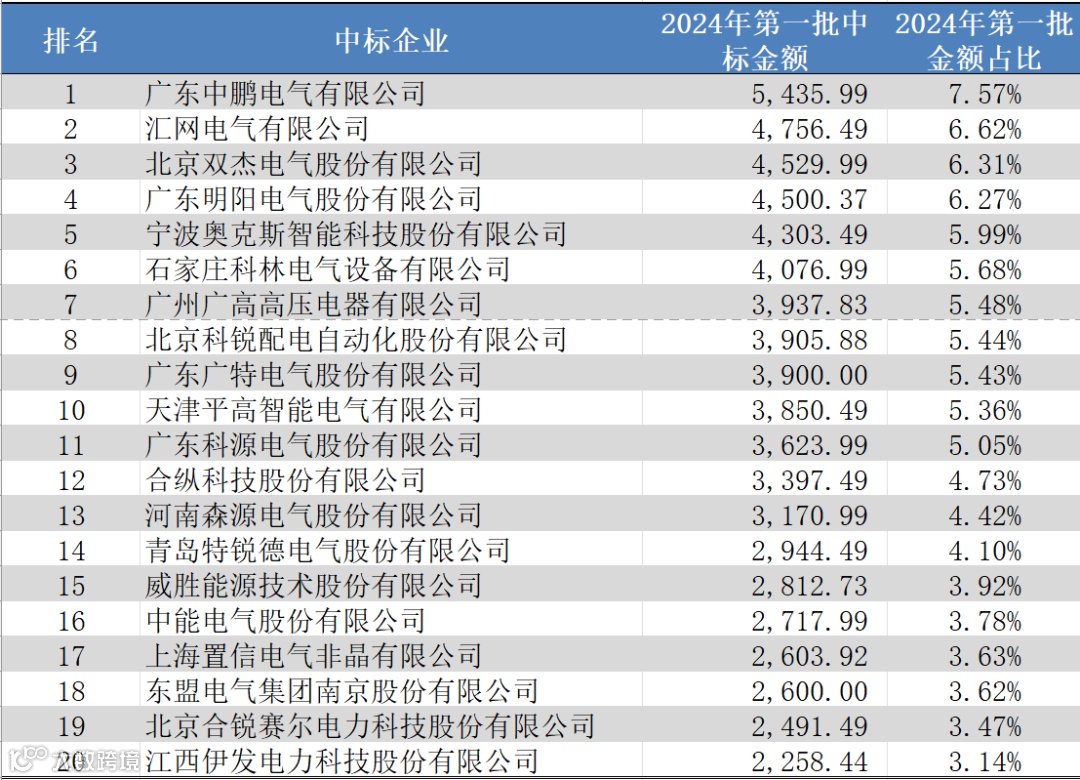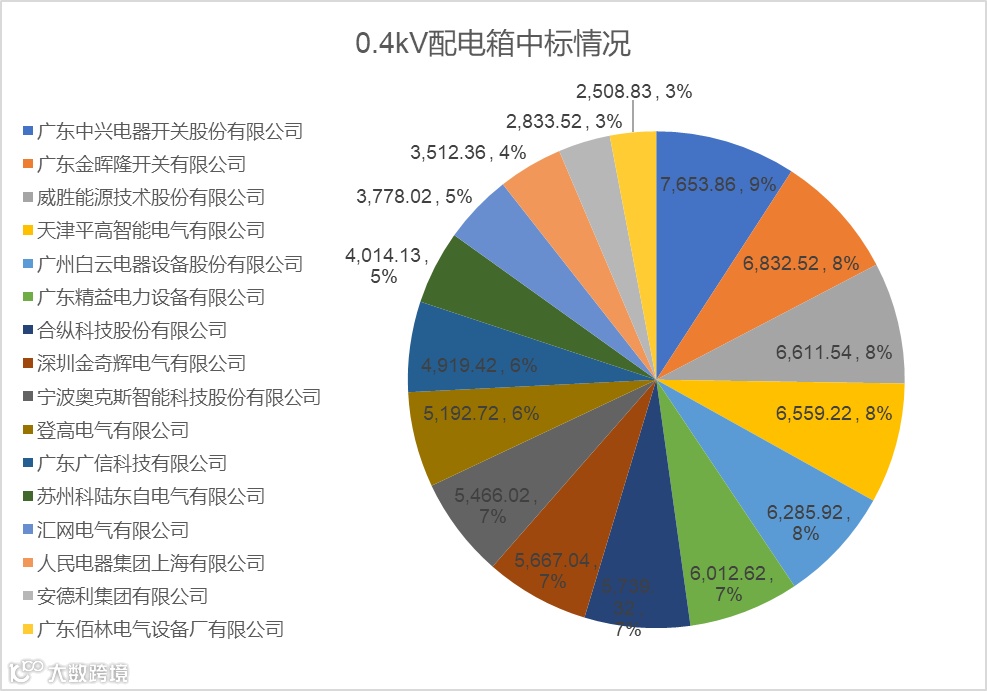 共有20家企业中标,中标金额前三位分别为:中鹏电气、汇网电气、双杰电气。