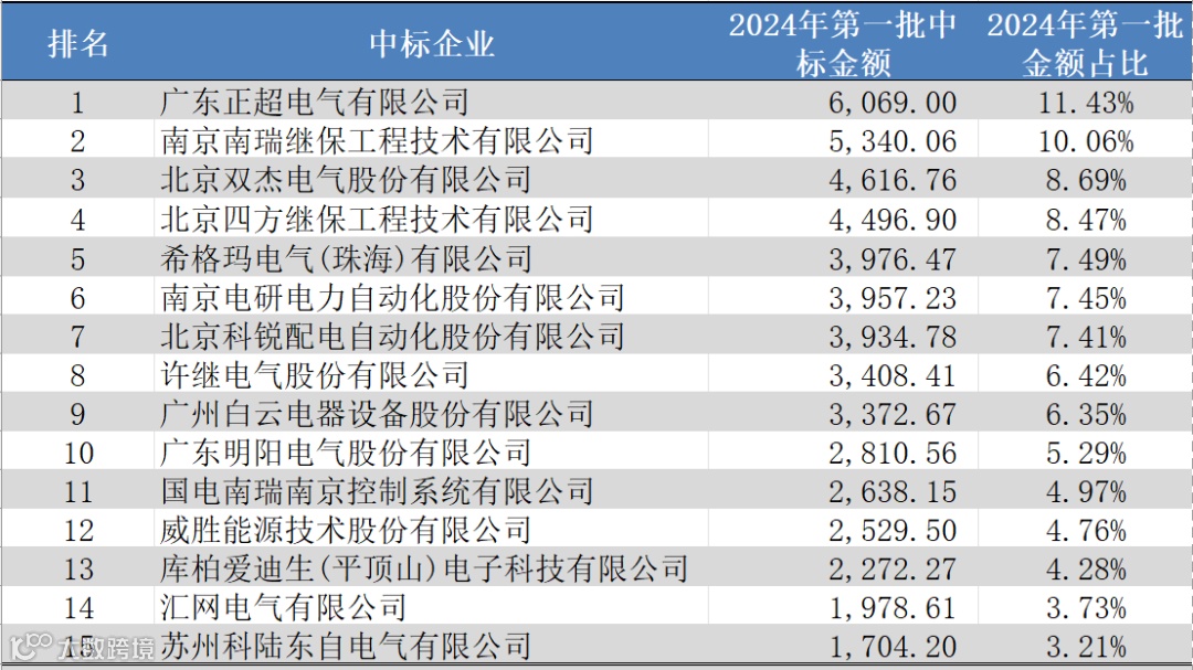 共有15家企业中标,中标金额前三位分别为:正超电气、南瑞继保工程、双杰电气。