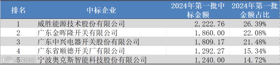 共有5家企业中标,中标金额前三位分别为:威胜能源、金晖隆开关、中兴电器。