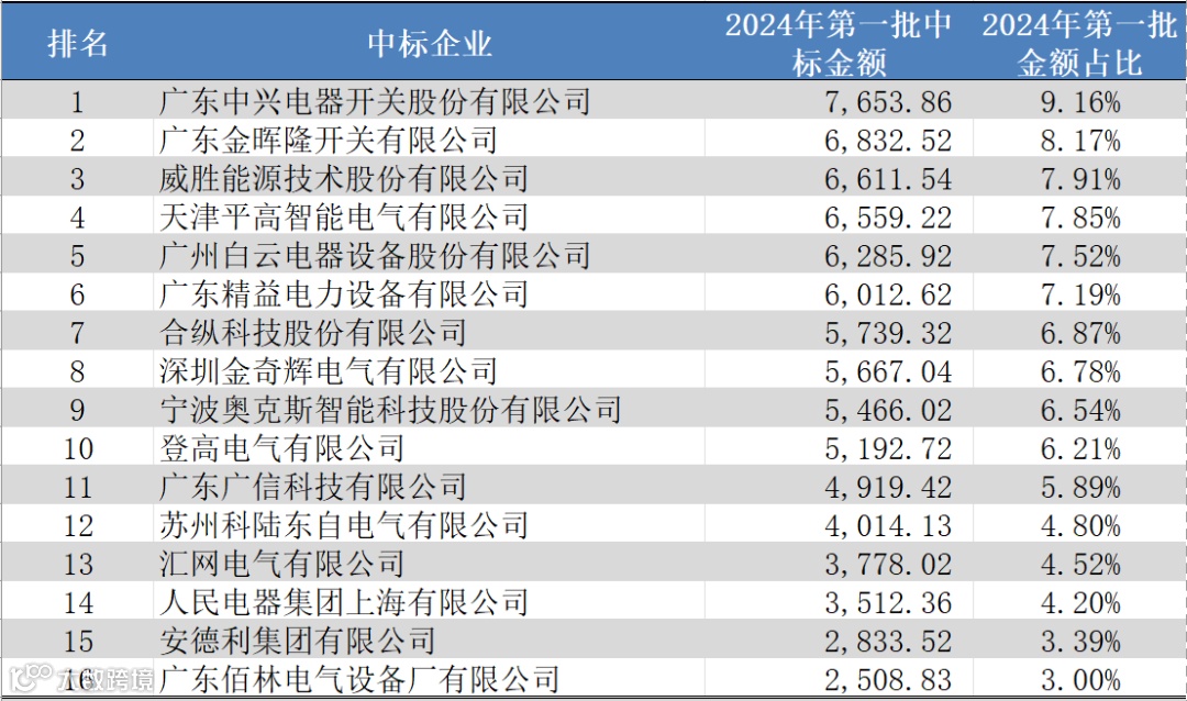 共有16家企业中标,中标金额前三位分别为:中兴电器、金晖隆开关、威胜能源。