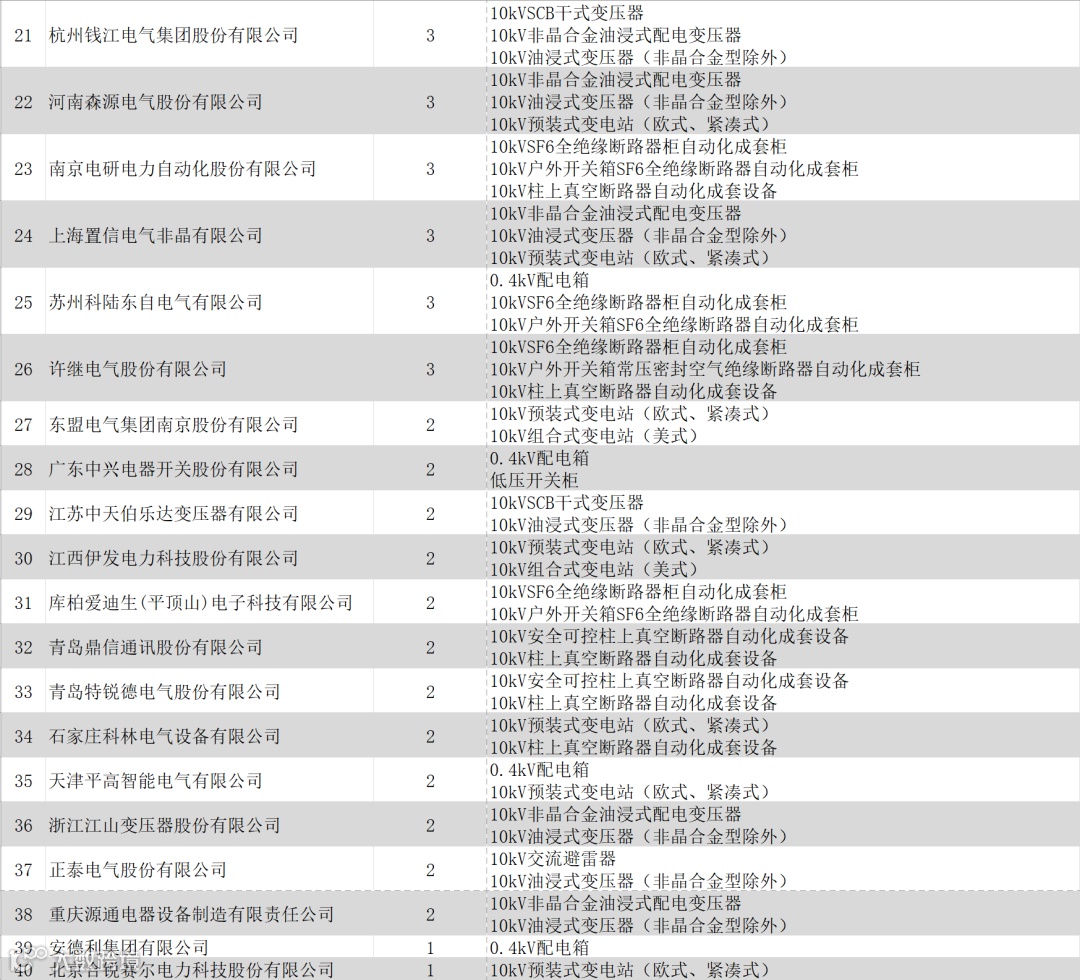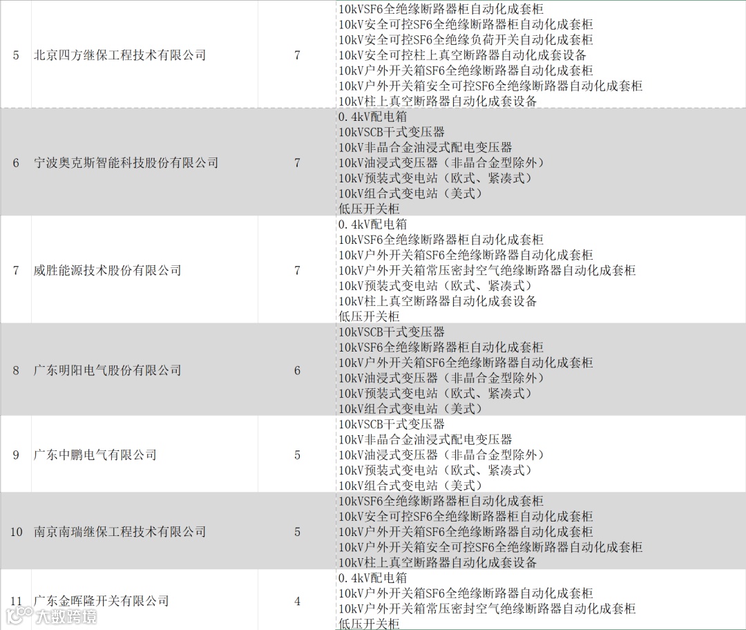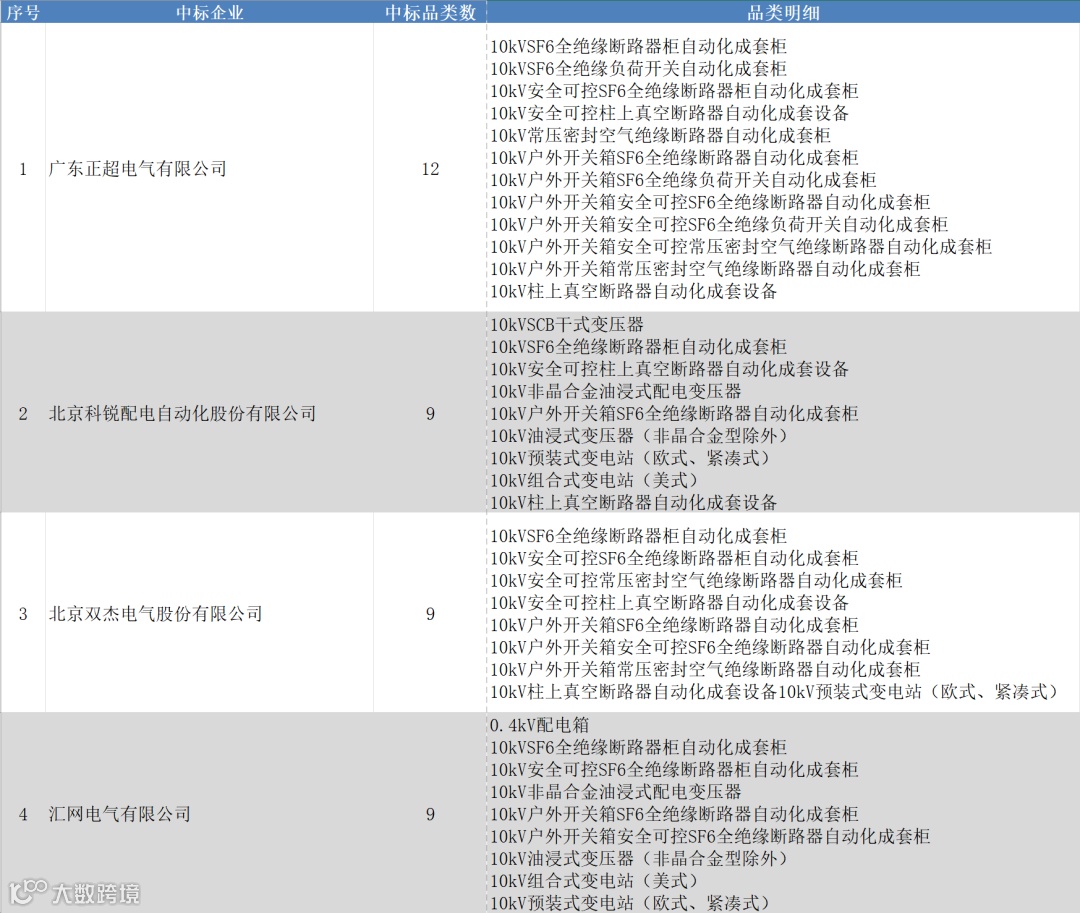 本次招标,仅正超电气中标12个品类的物资;北京科锐、双杰电气、汇网电气3家企业中标9个品类的物资。共有10家企业中标5个及以上数量品类的物资。