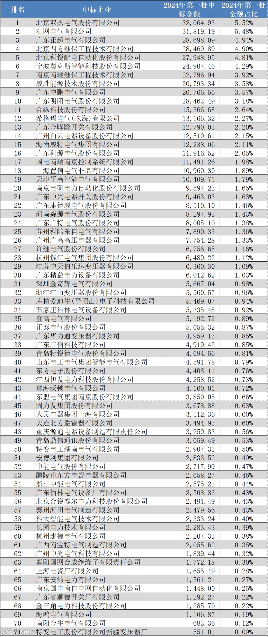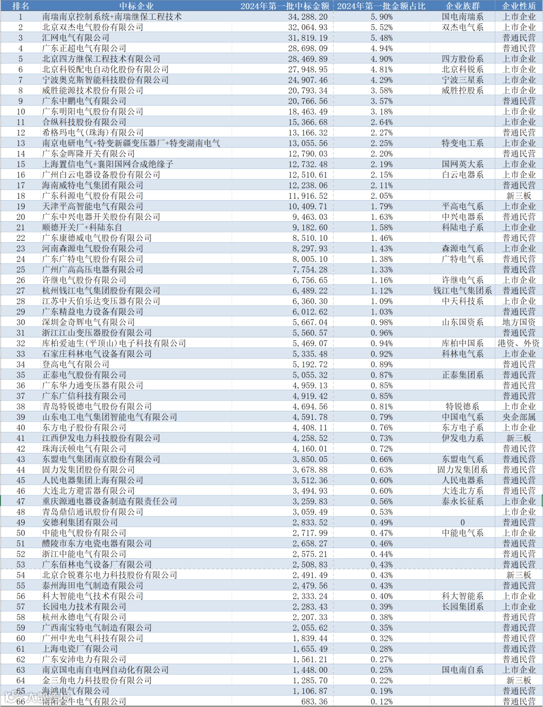 综合中标公示结果,国电南瑞系(南瑞南京控制系统+南瑞继保工程技术)合计中标金额34,288.2万元,合计市场占有率5.9%,处于领先位置。北京双杰电气股份有限公司合计中标金额32,064.93万元,合计市场占有率5.52%,紧随其后。汇网电气有限公司合计中标金额31,819.19万元,合计市场占有率5.48%,位居第三。