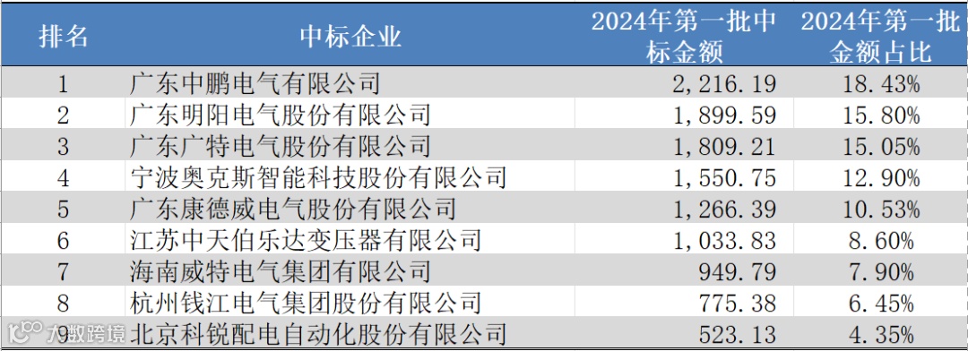 共有9家企业中标,中标金额前三位分别为:中鹏电气、明阳电气、广特电气。