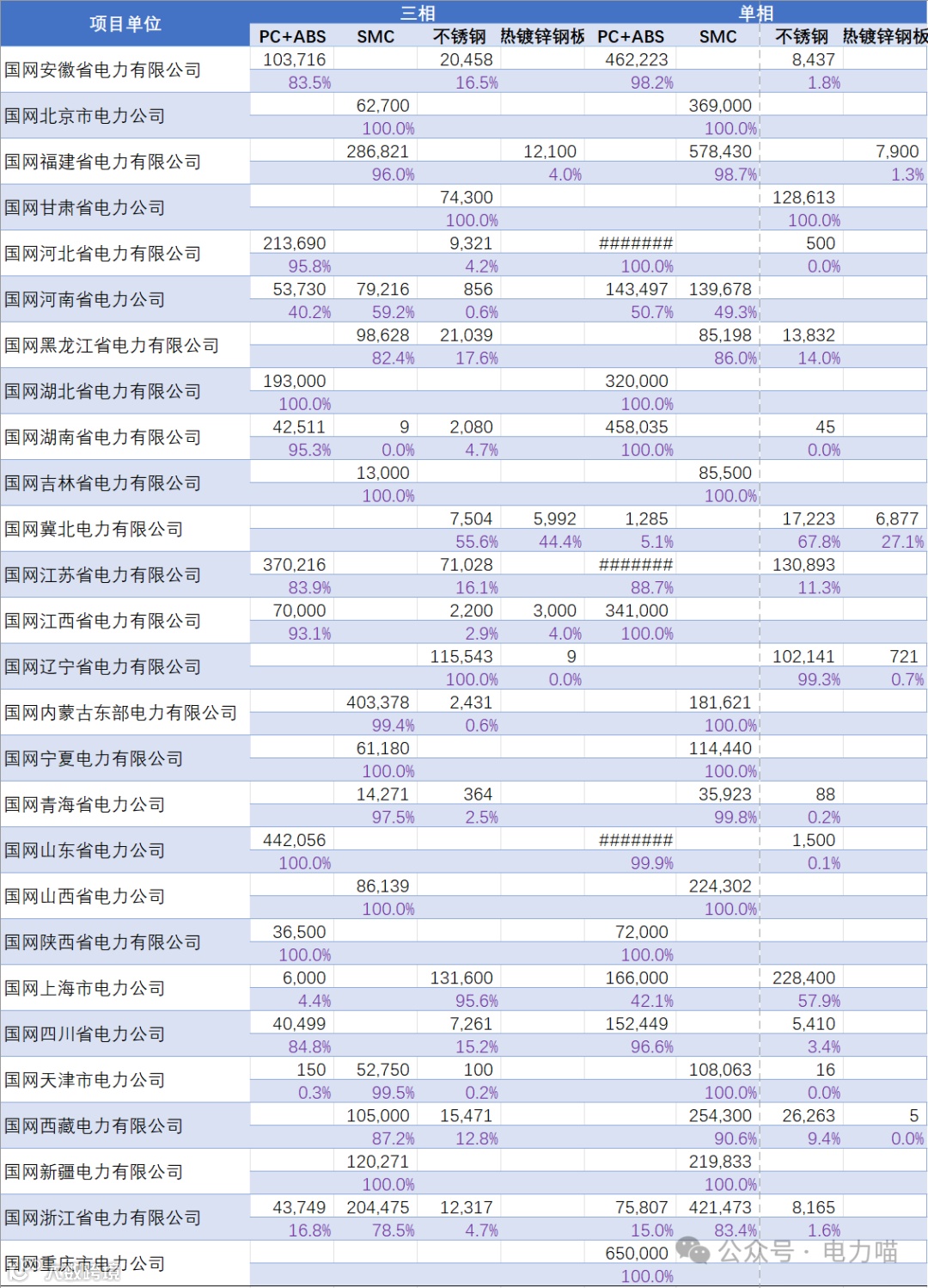 各电力全年共65个有电能计量箱产品的项目,合计980个包完成招标(即不含流标)。