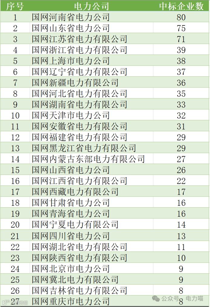 各电力公司中标企业数量方面,在国网河南省电力有限公司共有80家企业中标,超过10家企业中标的电力公司共有23个。