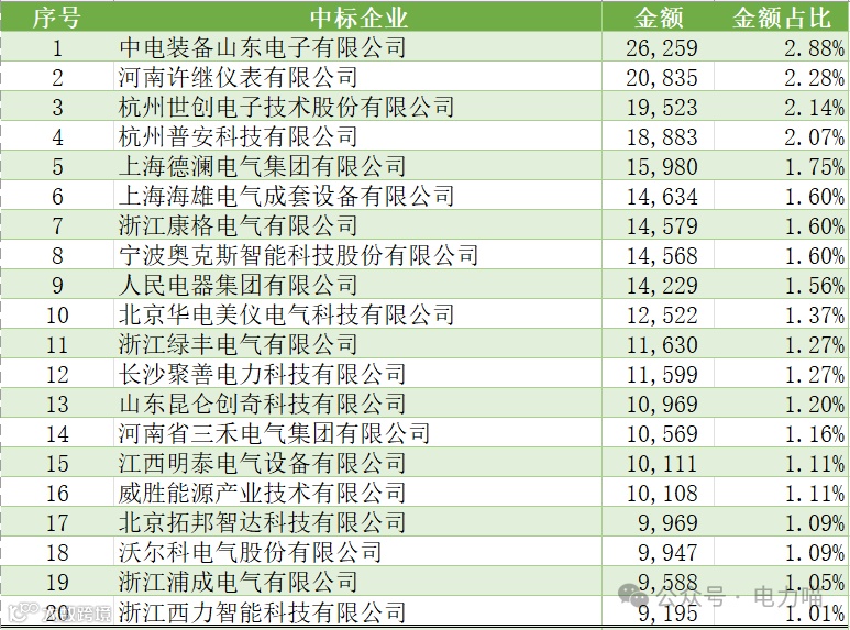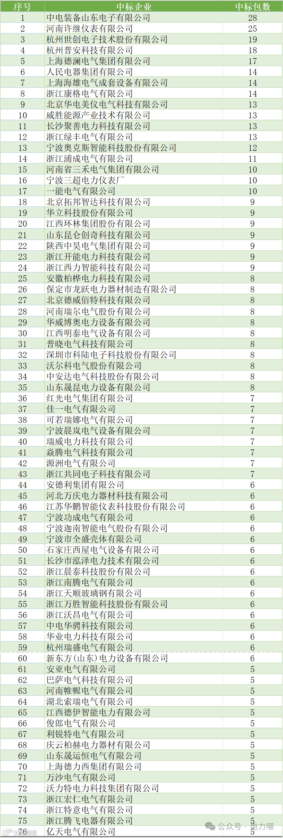 中标企业中,中电装备山东电子有限公司中标数量最多,占比2.73%;中标数量超过100,000只的企业共有43家,占中标企业总数量的17%;数量占比超过1%的企业共有27家,占中标企业总数量的11%;中标数量的中位数是53,703只,超过中位数的企业共有90家,占中标企业总数量的35%。
