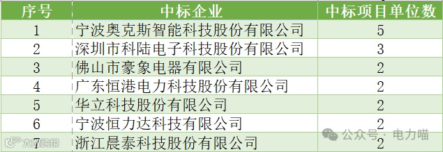 中标项目单位数方面,共有7家企业在两个或以上电力公司中标,占中标企业总数的47%。宁波奥克斯智能科技股份有限公司中标项目单位数最多,有5个。