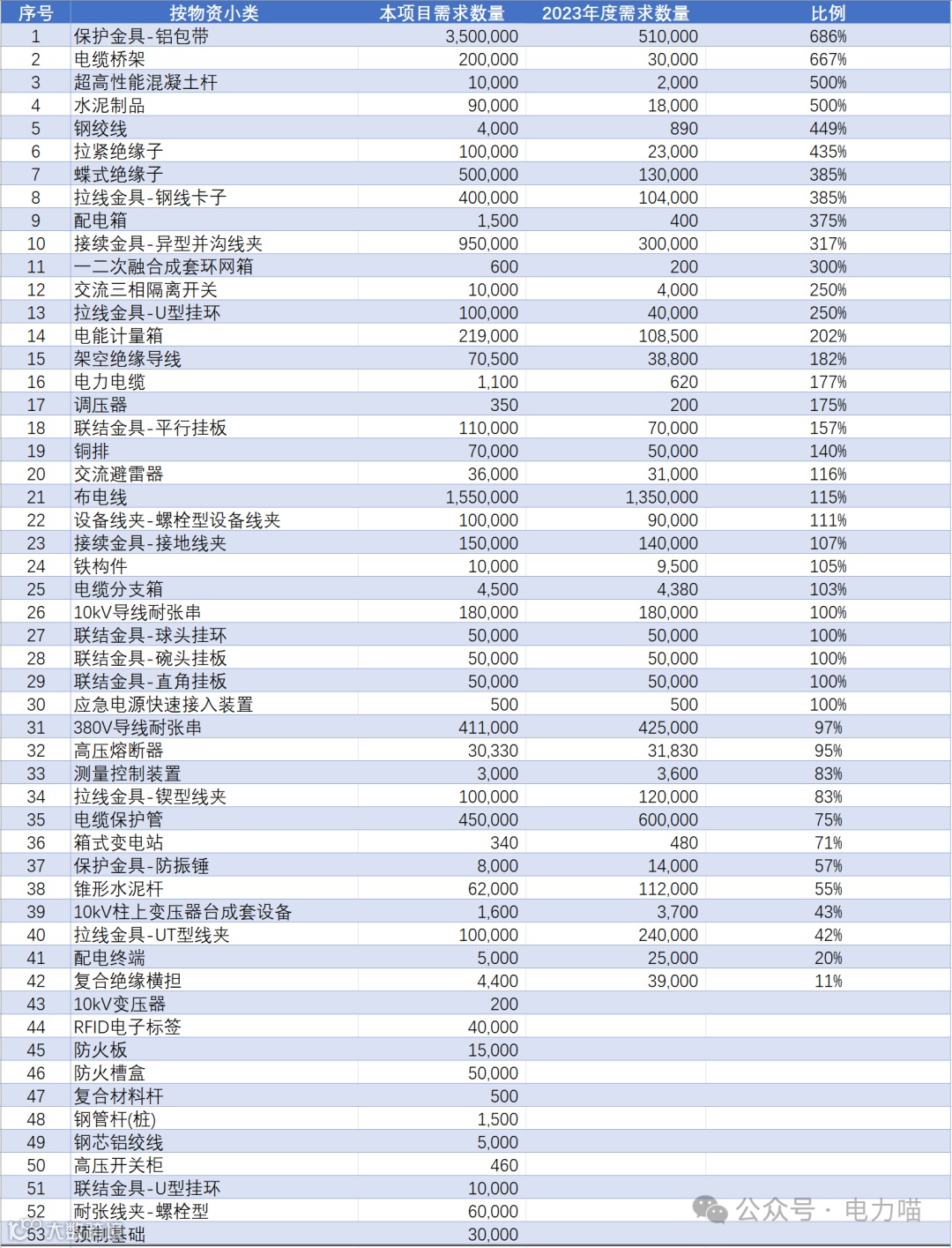 根据“国网陕西省电力有限公司2024年第一次配网物资协议库存”项目信息,按物资小类角度,本次共有53个物资小类产生需求。