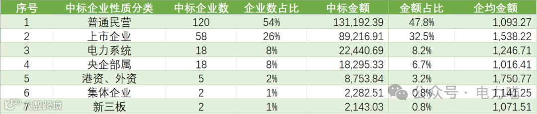 从中标企业数量看,普通民营企业最多,共120家,占比约54%。
