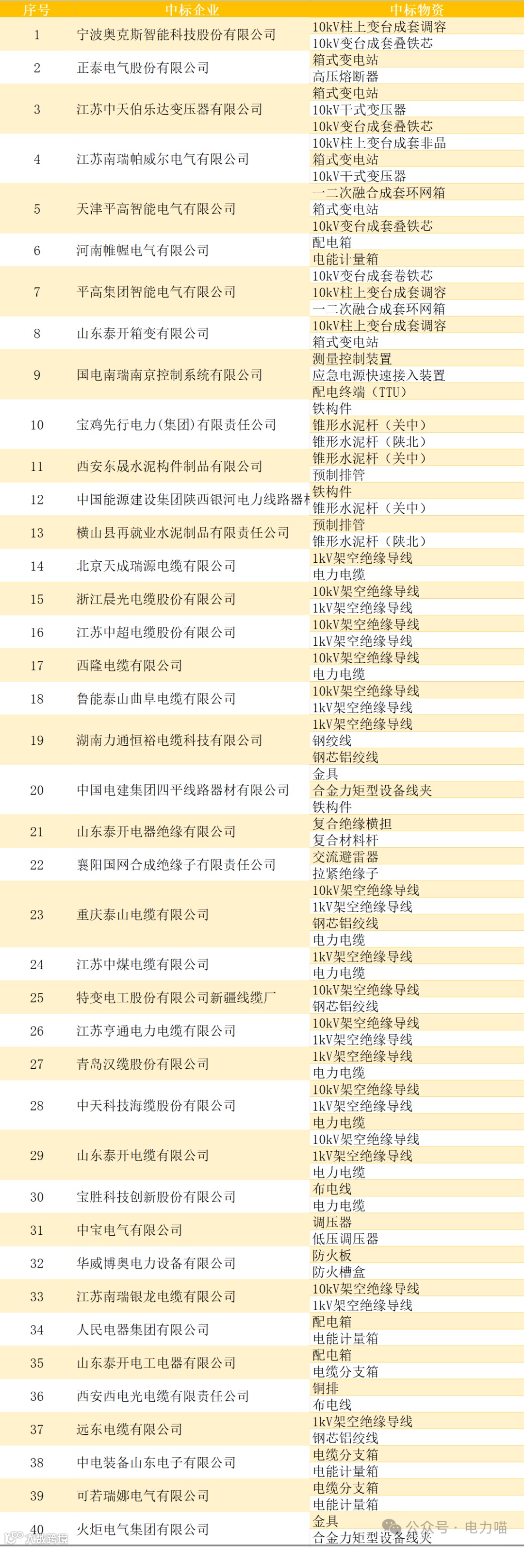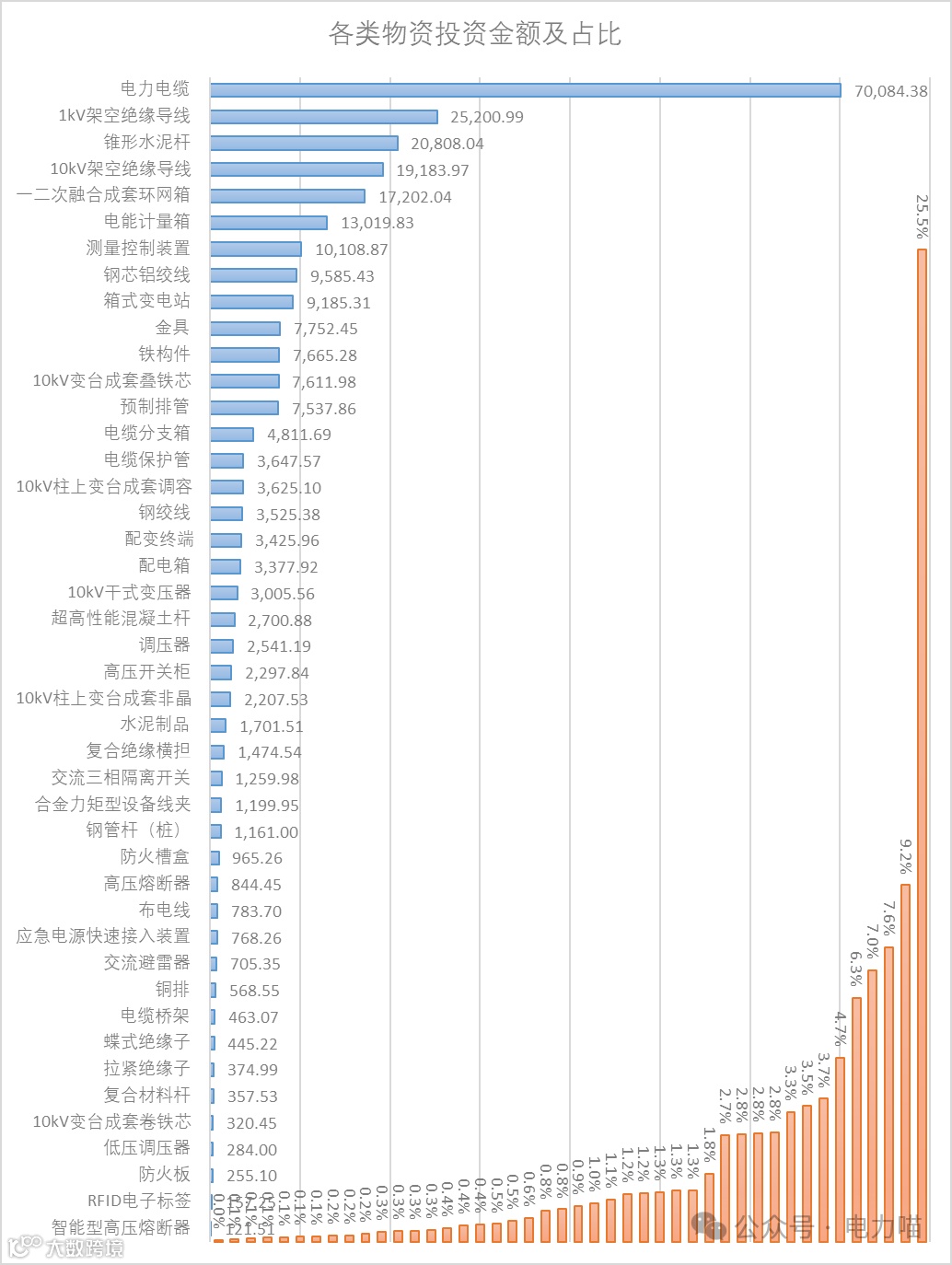 根据最终中标结果,电力电缆、1kV架空绝缘导线、锥形水泥杆、10kV架空绝缘导线、一二次融合成套环网箱、电能计量箱、测量控制装置等7类物资标段在本项目的投资金额超过1亿元,这7类物资投资金额占本次项目投资总金额的64%。