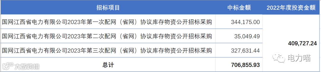 根据截止到本文发布日为止的信息,2023年度已安排了三次配网物资项目招标,合计中标金额约为706,855.93万元,是2022年度全年配网物资项目总中标金额的173%,同比增长73%。