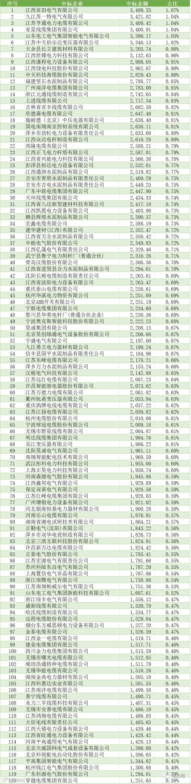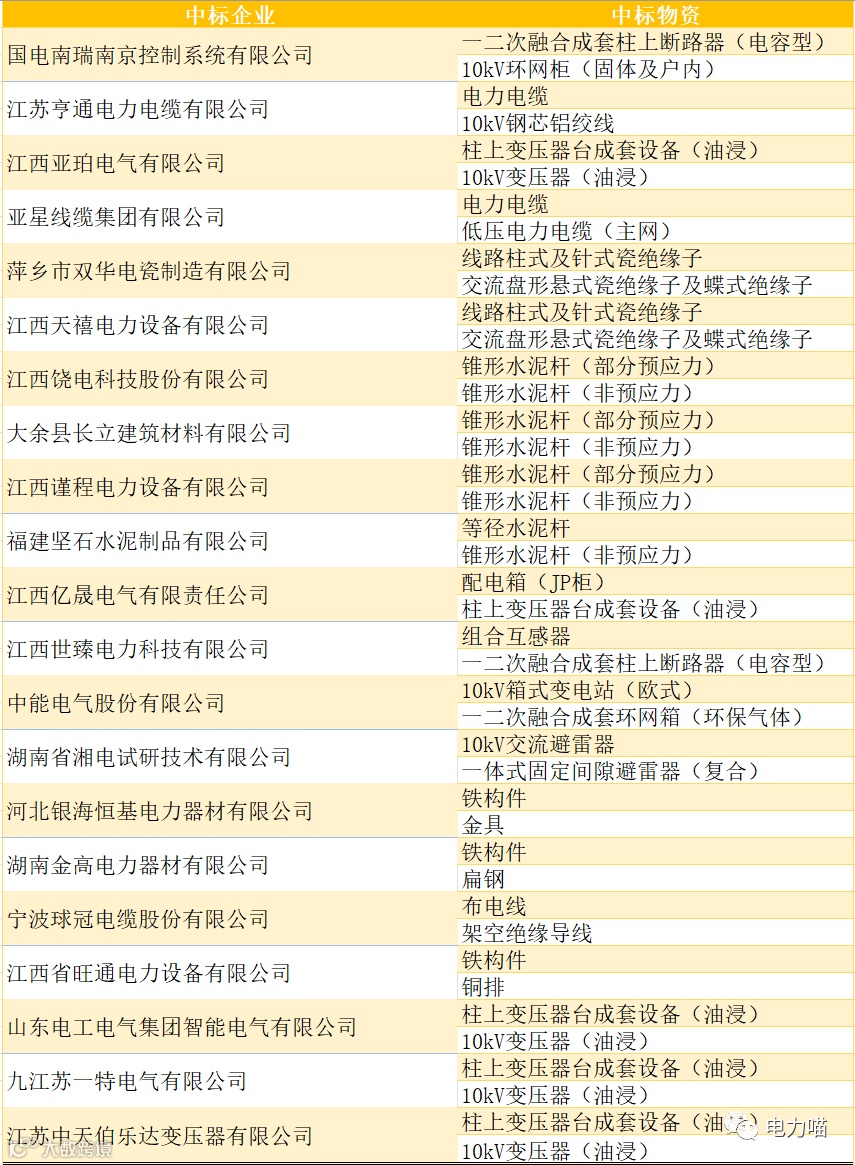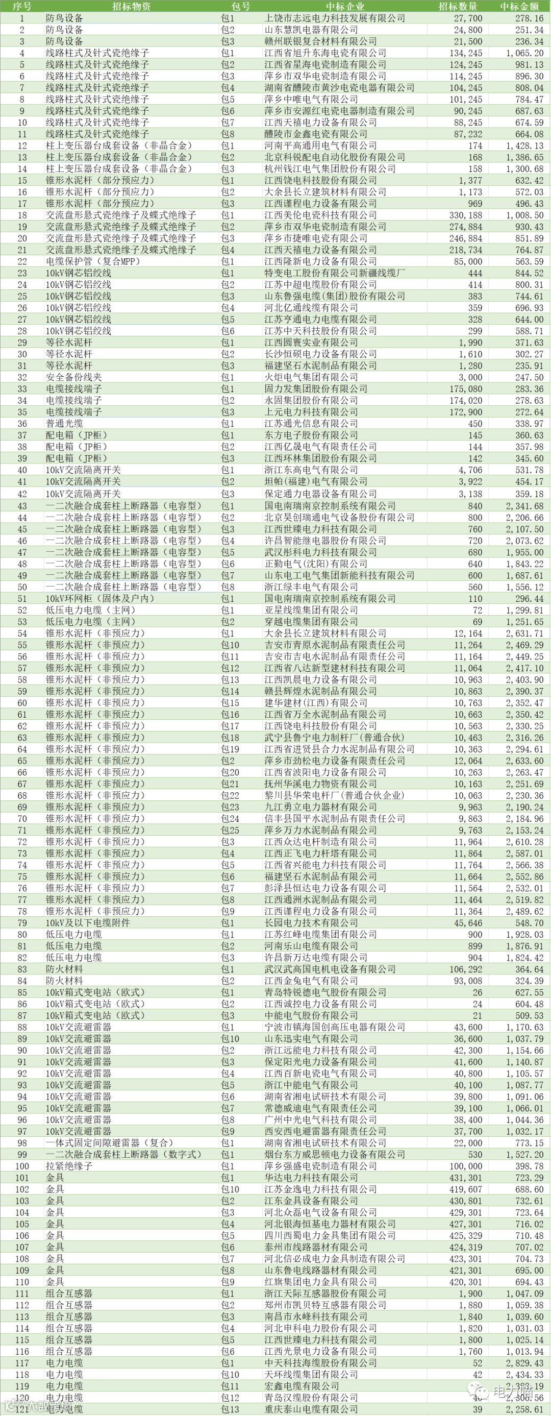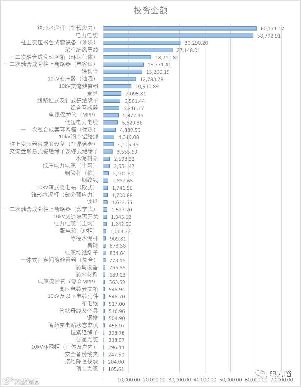 根据最终中标结果,共有锥形水泥杆(非预应力)、电力电缆、柱上变压器台成套设备(油浸)、架空绝缘导线、一二次融合成套环网箱(环保气体)、一二次融合成套柱上断路器(电容型)、铁构件、10kV变压器(油浸)、10kV交流避雷器等9个标段的物资在本项目投资金额超过1亿元。