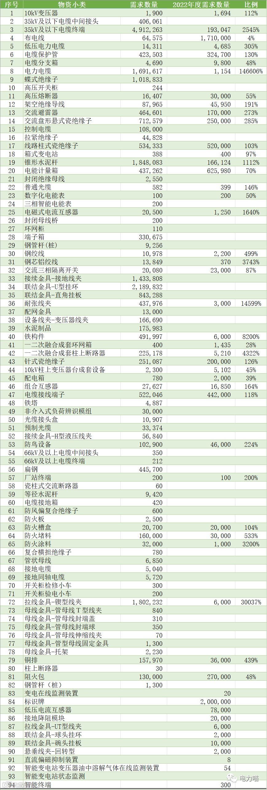其中,10kV变压器、交流避雷器、端子箱、一二次融合成套柱上断路器、组合互感器、非介入式负荷辨识模组、电磁式电流互感器等71个物资小类需求数量已经达到或超过2022年度全年需求数量。