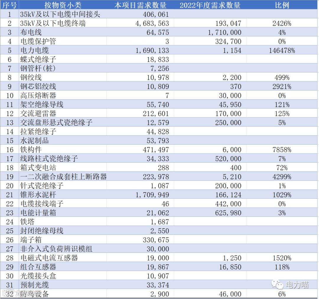 从各物资小类需求数量看,本次项目有22种物资的招标数量达到或超过2022年度全年需求数量,如交流避雷器、一二次融合成套柱上断路器、电磁式电流互感器等。