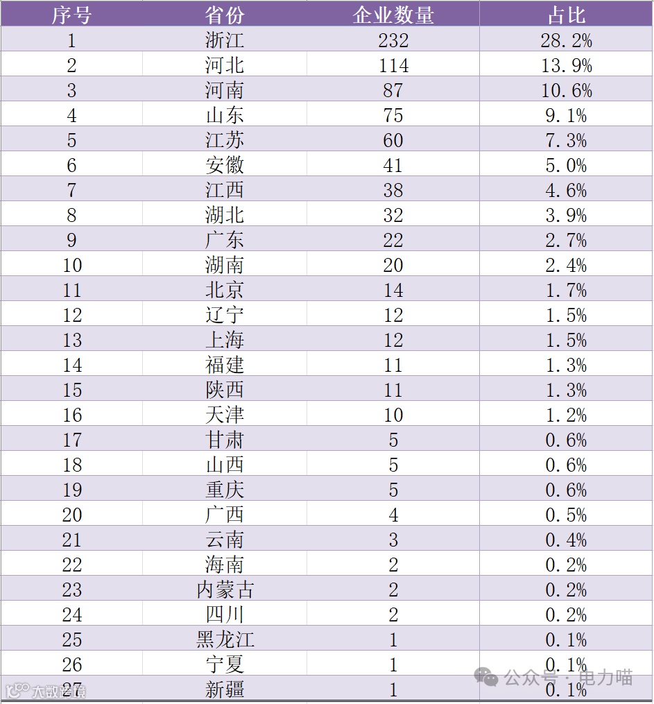 这822家企业分布在27个省市自治区,河南、浙江是产业大省,属地企业数量都超过100家家。