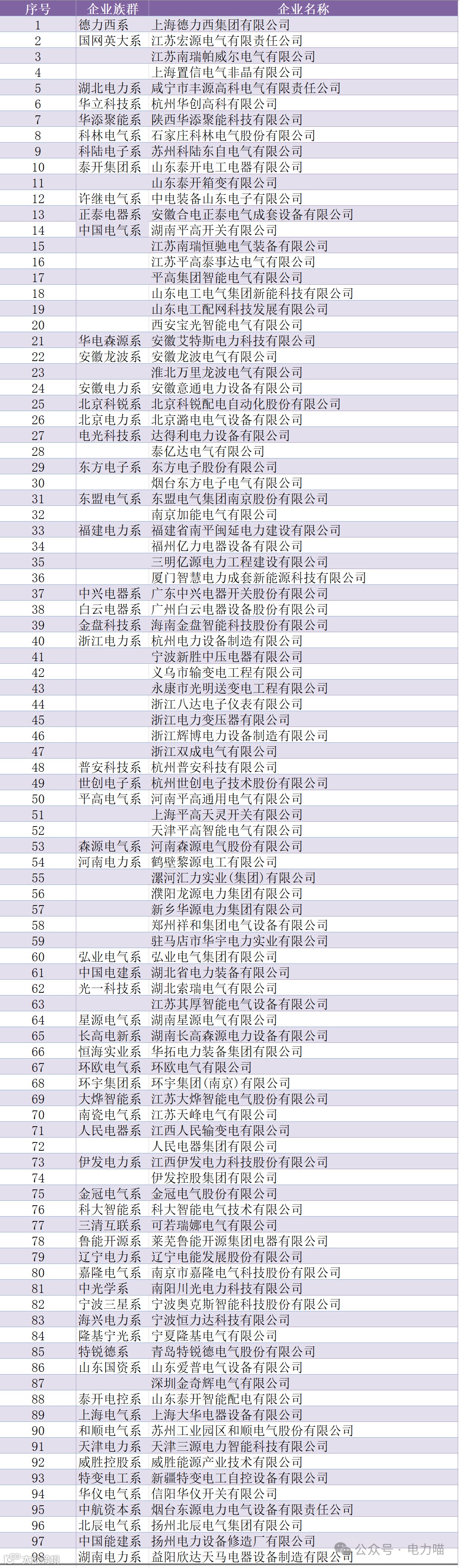 分析这些企业的股东和对外投资情况,参与电网业务的企业族群中共有64个企业族群的98家企业参加审核。其中国网英大系有3家参加、泰开集团系有2家参加、中国电气系有7家企业参加、安徽龙波系有2家企业参加、电光科技系有2家企业参加、东方电子系有2家企业参加、东盟电气系有2家企业参加、福建电力系有4家企业参加、浙江电力系有8家企业参加、平高电气系有3家企业参加、河南电力系有6家企业参加、光一科技系有2家企业参加、人民电器系有2家企业参加、伊发电力系有2家企业参加、山东国资系有2家企业参加。