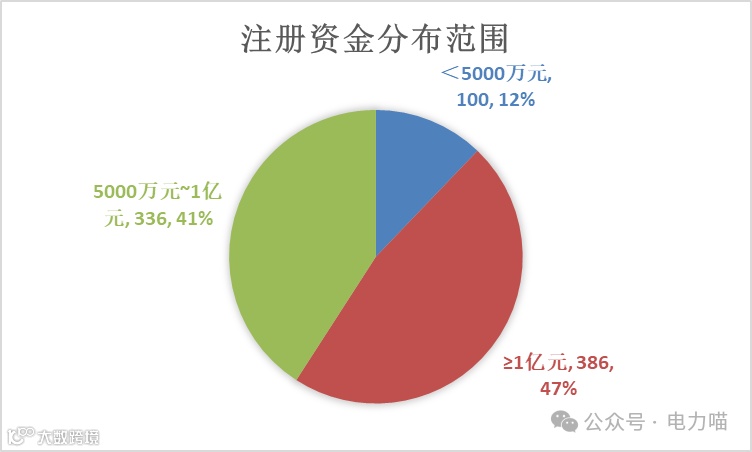 调查这822家企业的注册资金,最多的超过13亿元,最少的300万元。注册资金超过1亿元的企业数量共有386家,占比47%,这个区间的企业数量最多。