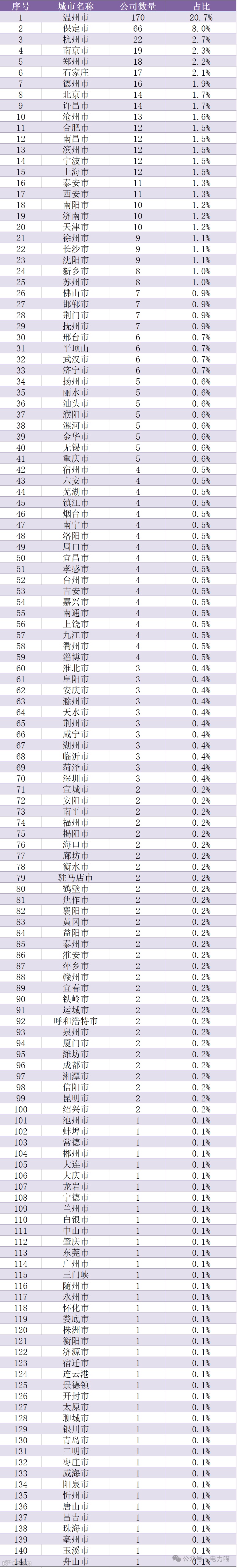 从企业注册地看,这822家企业分布在141个城市。温州不愧为“中国电器之都”(乐清)所在地,单一城市有170家企业,占比约21%。另外,保定、杭州等19各城市也是配电箱(JP)柜产业集中地,分别都有超过10家企业。