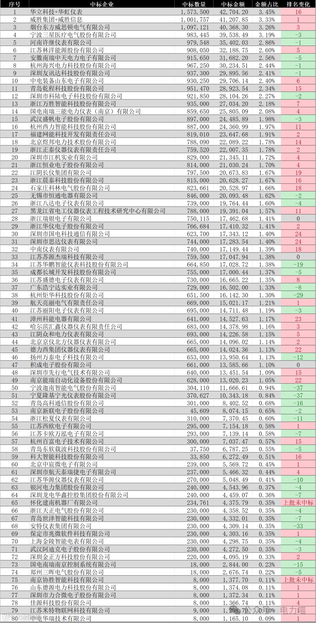 前10名合计市场份额环比下降0.84个百分点,本批次电能表整体集中度继续略有下降; -