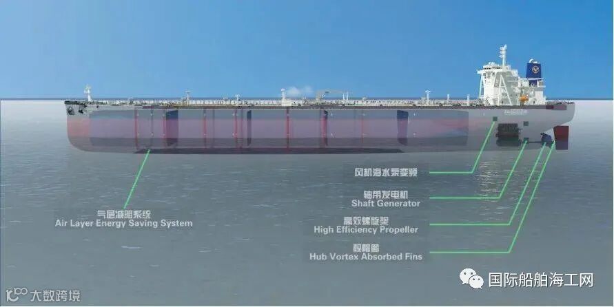 “凯辉”轮是大连造船牵头,联合招商轮船、中国船舶702所、中船节能公司、中国船级社等单位在共同开展多类节能技术集成应用研究基础上,打造的具有节能、降耗、智能特点的绿色生态环保示范船。该船首次安装气层减阻系统以及具有大连造船自主知识产权的多节能集成控制系统(ICEE)。气层减阻系统是一种创新节能技术,通过在船底形成均匀稳定的气层,达到降低船舶摩擦阻力和主机功率的目的;多节能集成控制系统(ICEE),具有多节能设备控制及节能效果监测分析、航速优化、纵倾优化、智能配载、船舶维保、网络安全等智慧功能。