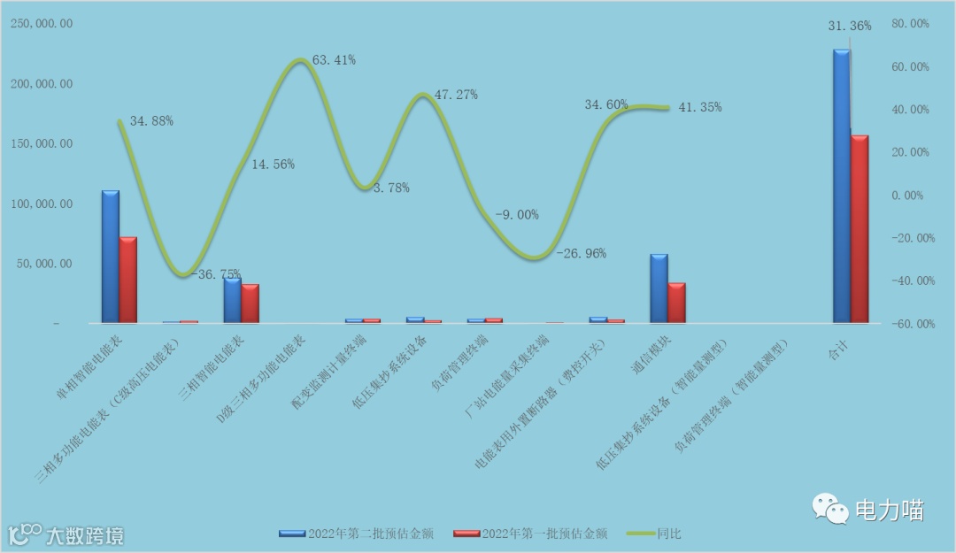 从同比数据来看,本次招标共有7个品类的投资金额同比明显增长,除单相智能电能表、厂站电能量采集终端、电能表用外置断路器(费控开关)之外,同比都明显增加。