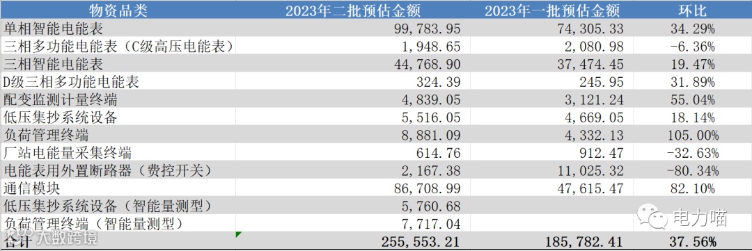 具体到各物资品类,本次招标共12个品类的投资金额,7个品类环比增长,除三相多功能电能表(C级高压电能表)、厂站电能量采集终端、电能表用外置断路器(费控开关)之外,环比都大幅增加。