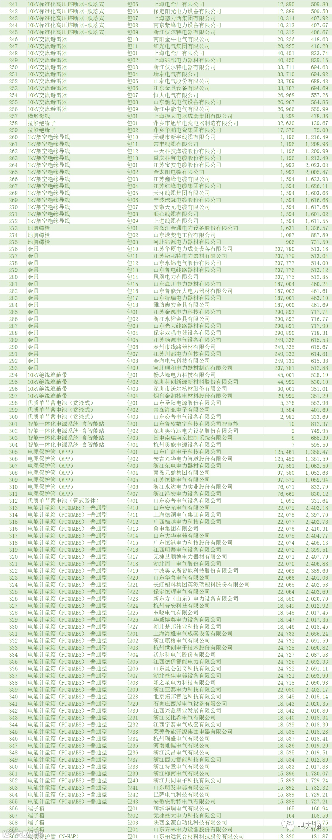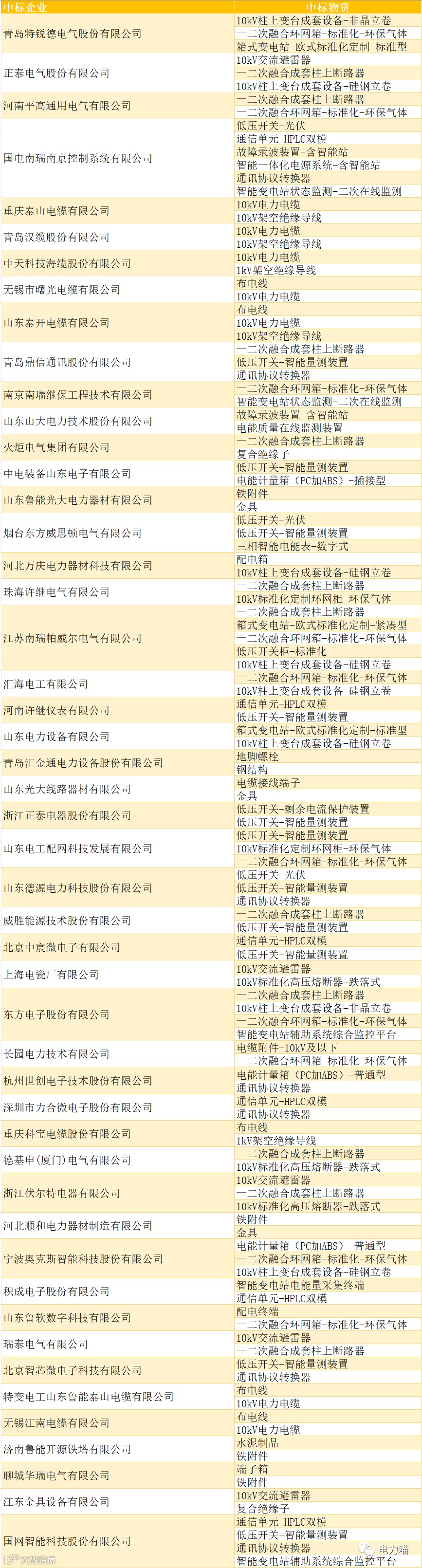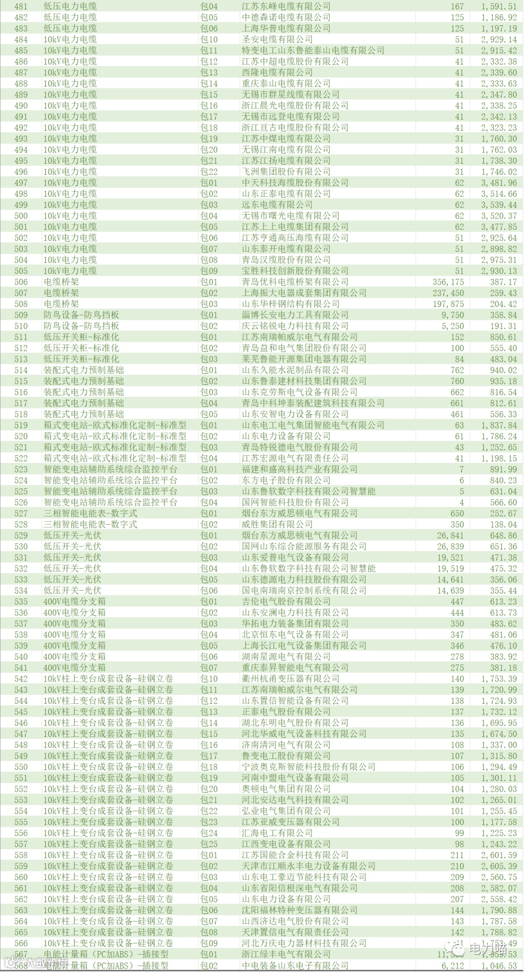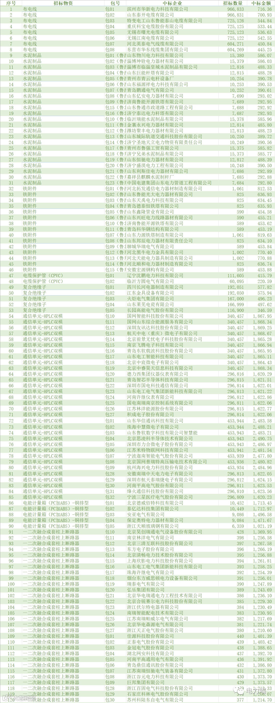根据最终中标结果,共有电能计量箱(PC加ABS)-普通型、通信单元-HPLC双模、锥形水泥杆-非预应力、10kV电力电缆、一二次融合成套柱上断路器、10kV柱上变台成套设备-硅钢立卷、10kV架空绝缘导线、低压开关-智能量测装置、一二次融合环网箱-标准化-环保气体、10kV柱上变台成套设备-非晶立卷、1kV架空绝缘导线、通讯协议转换器、金具等13个标段在本项目投资金额超过1亿元。