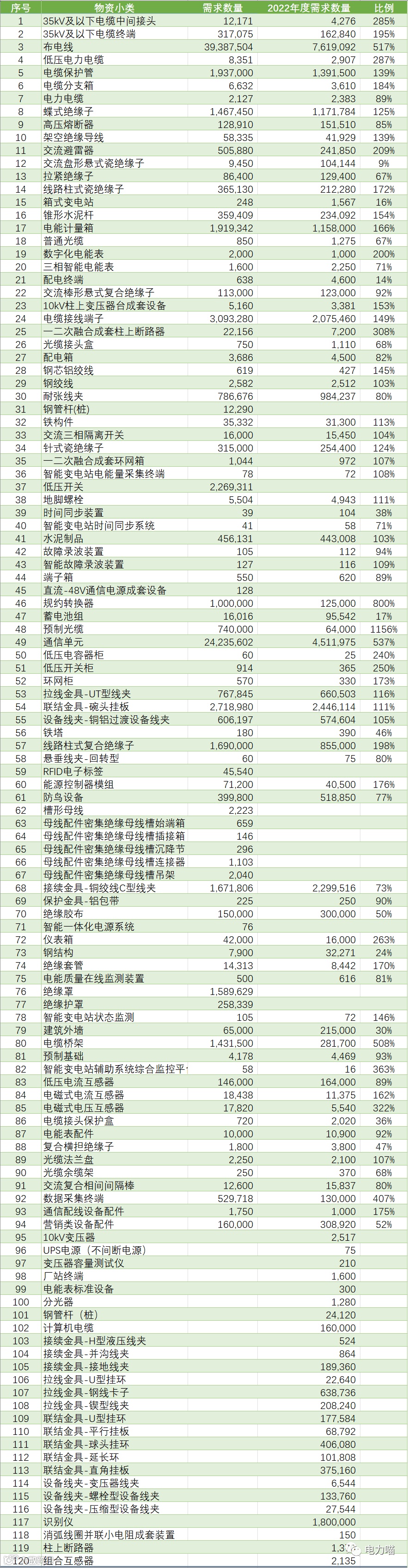 根据截止到本文发布日为止的信息,2023年度已经产生需求的配网物资(按物资小类)共有94种,相关需求数量详见下表。另有26种在2022年度有需求的物资在2023年度还未产生需求。