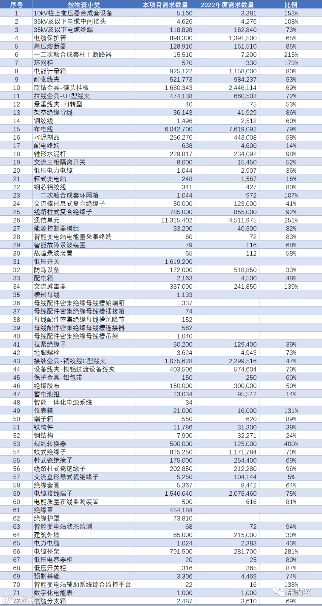 其中,电缆分支箱、交流避雷器、电能计量箱、数字化电能表、10kV柱上变压器台成套设备、一二次融合成套柱上断路器、交流三相隔离开关、一二次融合成套环网箱、智能变电站电能量采集终端、规约转换器、通信单元、低压开关柜、环网柜、能源控制器模组、仪表箱、数据采集终端等47个物资小类需求数量已经达到或超过2022年度全年需求数量;箱式变电站、配电终端、蓄电池组等14个物资小类需求数量占2022年度全年需求数量的比例低于67%。