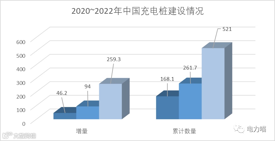 2022年全年,充电基础设施增量为259.3万台,中国充电基础设施累计数量达到521万台,同比增长99%。