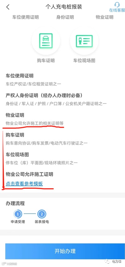 此页面有需要提交哪些证明材料的说明,这里需要强调的是,若车位非车主本人所有,则务必一起提交车主与车位所有人之间的关系证明,避免被退回要求补充资料(不过,国网就这个问题的处理很人性化,如果资料不全被退回的话,会电话通知户主,并且只需要补充提交,不需要从头重新提交)。物业公司允许施工证明可以直接下载APP中的模板,填写好后去小区物业办公室申请盖章。