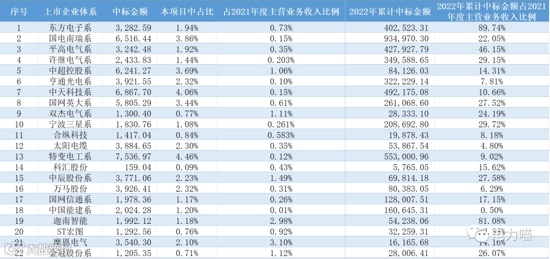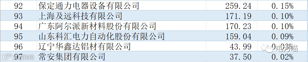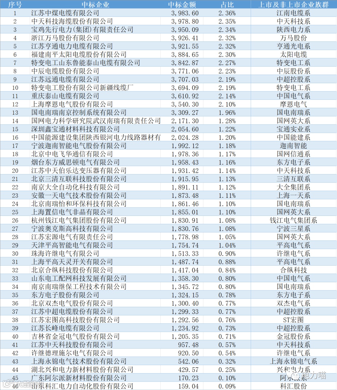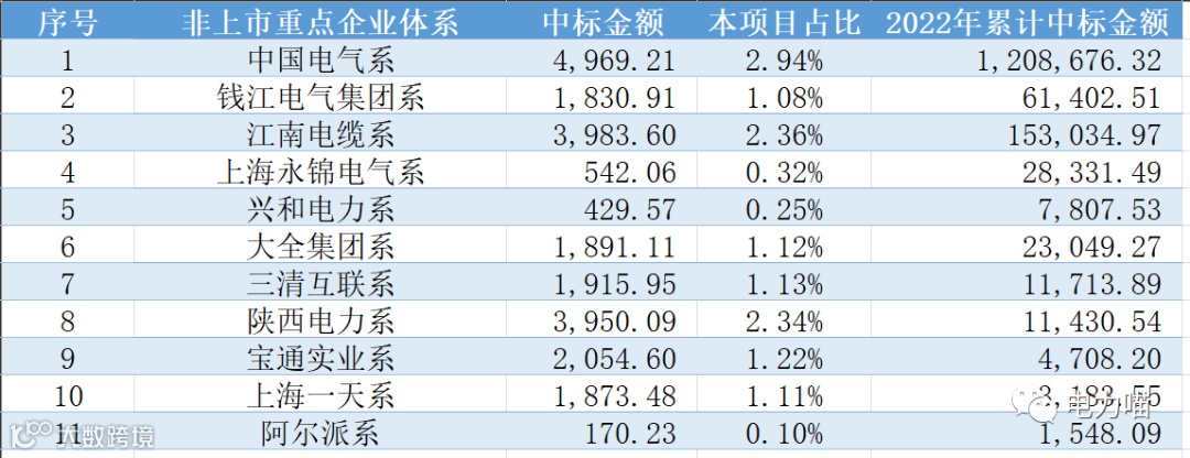在本项目中标的11个非上市企业族群中,合计中标金额占比约14%;中国电气系等8个企业族群中标金额超过1000万元。