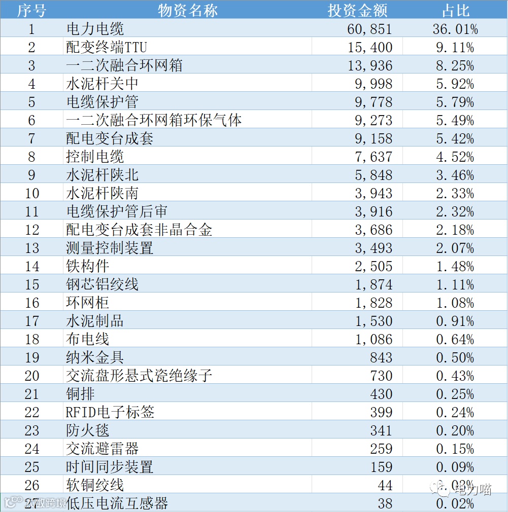 国网陕西2022年第二次配网设备材料协议库存招标项目共招标了28种物资,从各物资投资力度角度,结合中标金额,电力电缆物资投资力度最大,合计60,851万元,占比约36%。