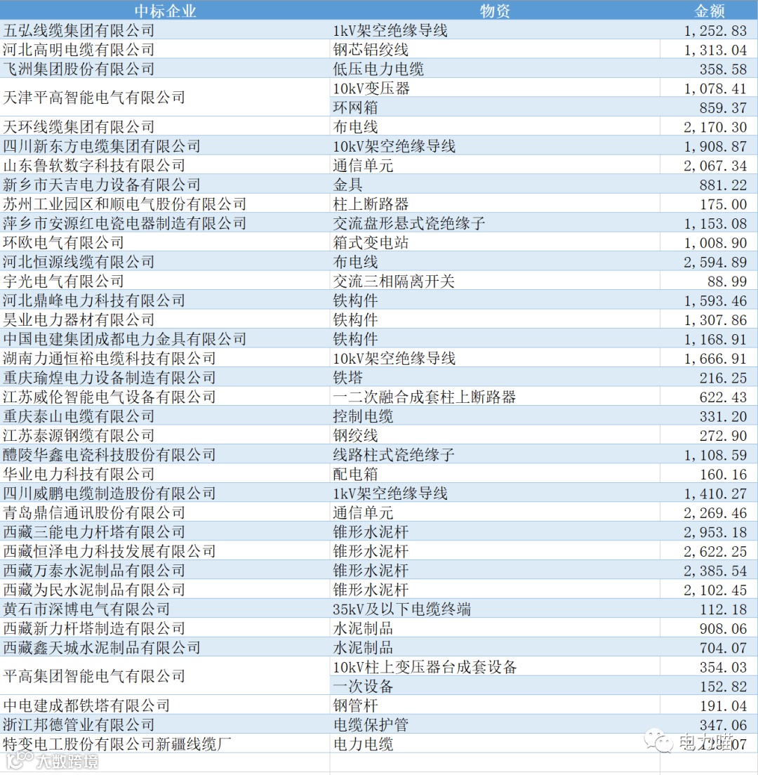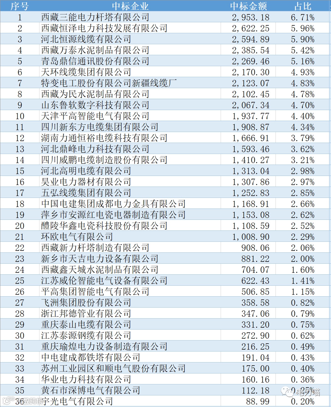 根据最终中标情况,本次项目共有36家企业中标,合计中标金额约43,995万元。单一企业中标金额最多的是西藏三能电力杆塔有限公司,中标金额约为2,953万元,占比约6.7%。共有21家企业中标金额超过1,000万元的企业,合计金额占比87%。