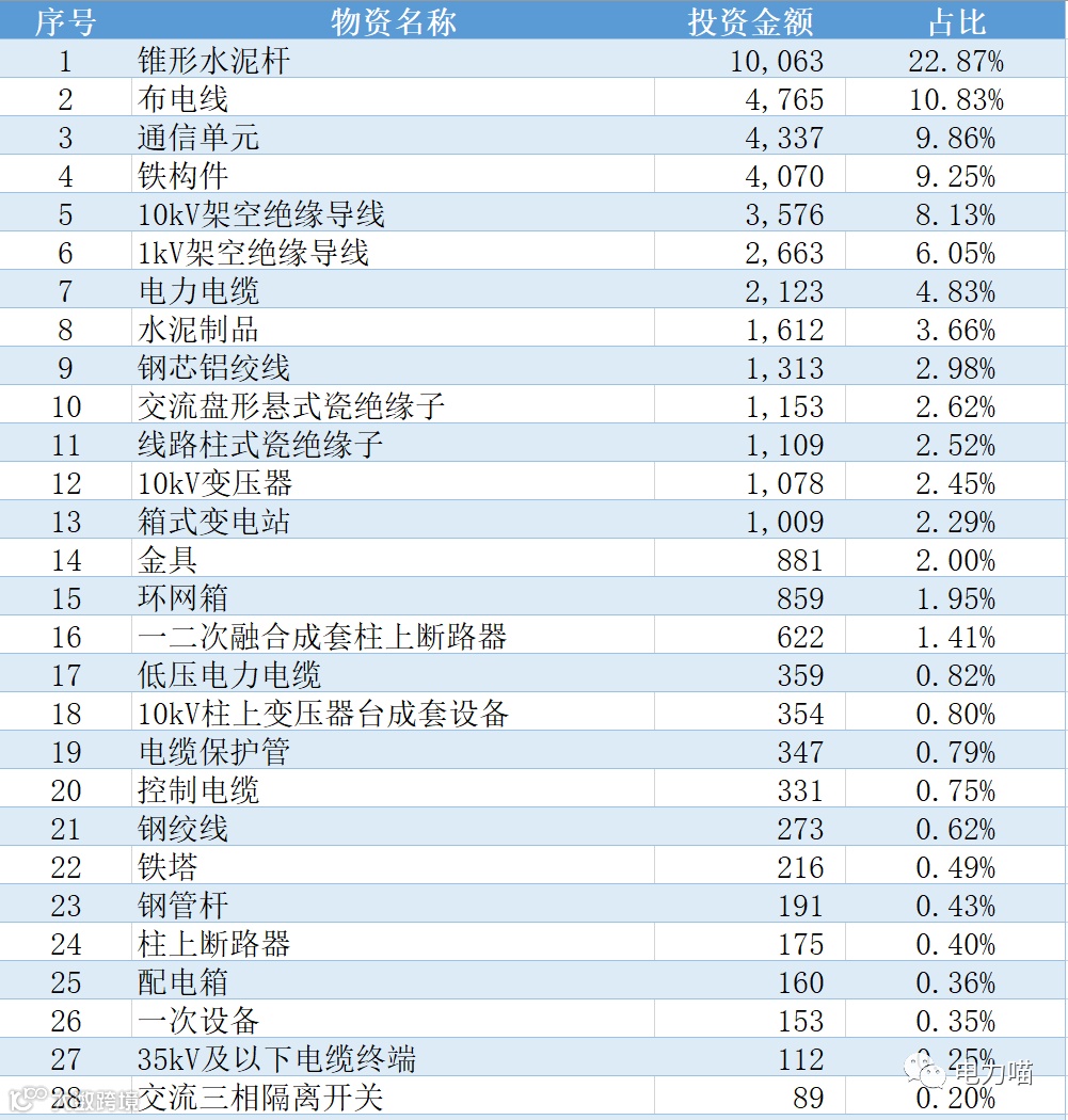 国网西藏2022年第二次配网物资协议库存招标项目共招标了28种物资,从各物资投资力度角度,结合中标金额,锥形水泥杆物资投资力度最大,合计10,063万元,占比约23%。