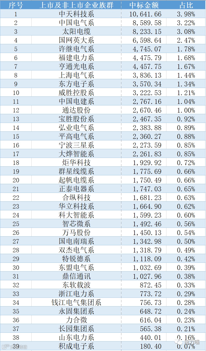 综合来看,中天科技系合计中标金额最高,约10,642万元,约占本次招标总金额的4%。