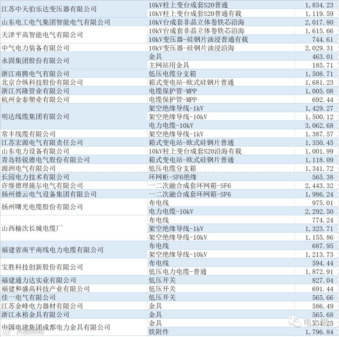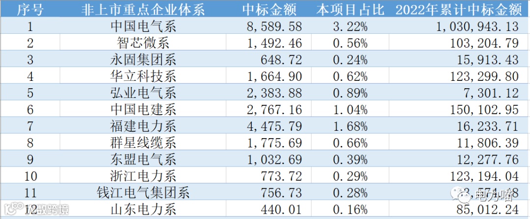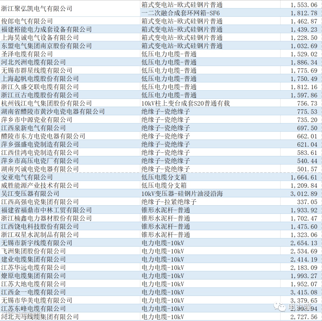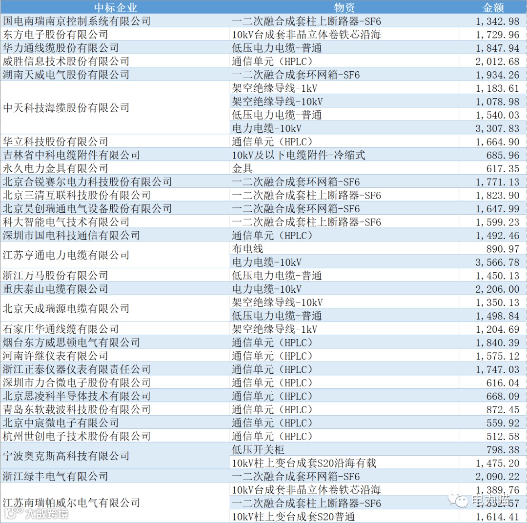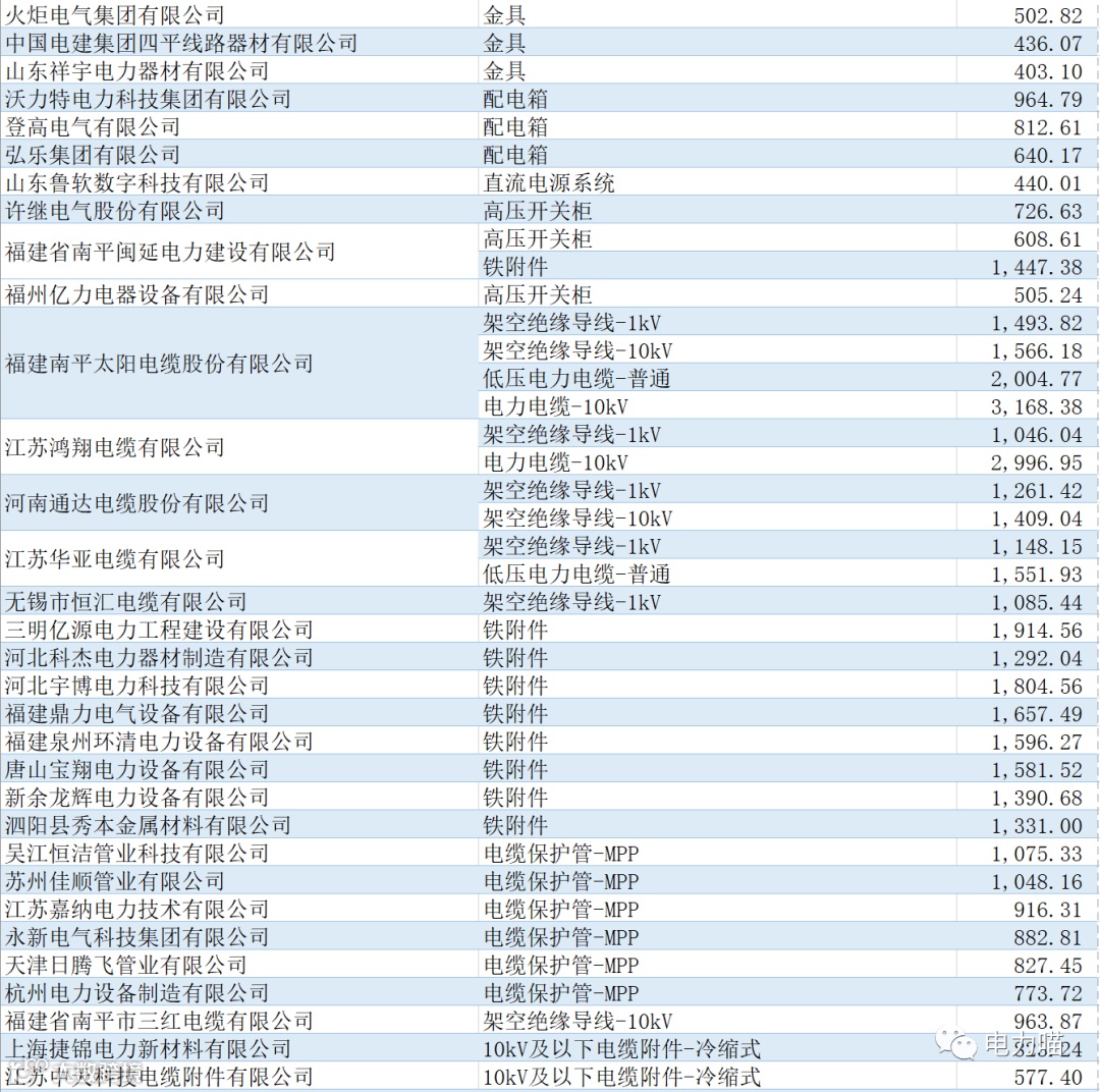根据最终中标情况,本次项目共有167家企业中标,合计中标金额约267,117万元。单一企业中标金额最多的是福建南平太阳电缆股份有限公司,中标金额约为8,233万元,占比约3%。共有109家企业中标金额超过1,000万元的企业,合计金额占比87%。
