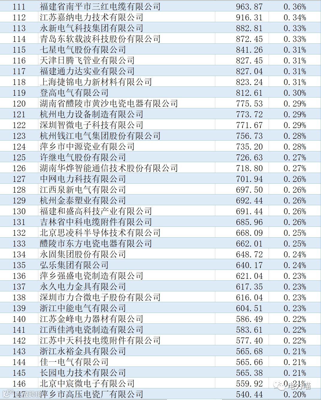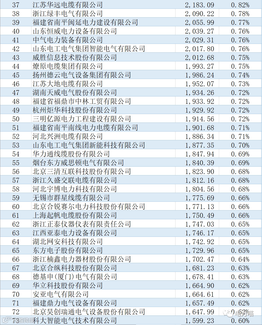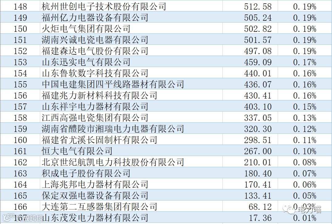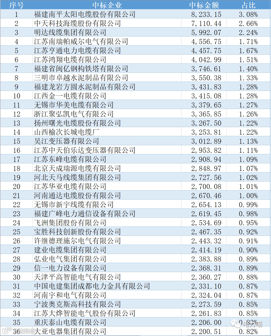 根据最终中标情况,本次项目共有167家企业中标,合计中标金额约267,117万元。单一企业中标金额最多的是福建南平太阳电缆股份有限公司,中标金额约为8,233万元,占比约3%。共有109家企业中标金额超过1,000万元的企业,合计金额占比87%。