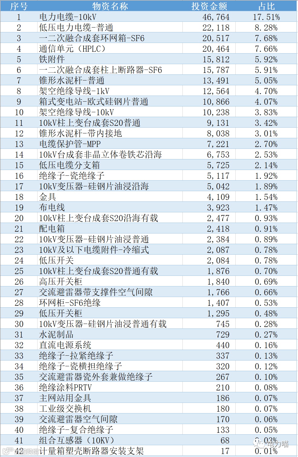 国网福建2022年第二次配网物资协议库存招标项目共招标了42种物资,从各物资投资力度角度,结合中标金额,电力电缆-10kV物资投资力度最大,合计46,764万元,占比约18%。