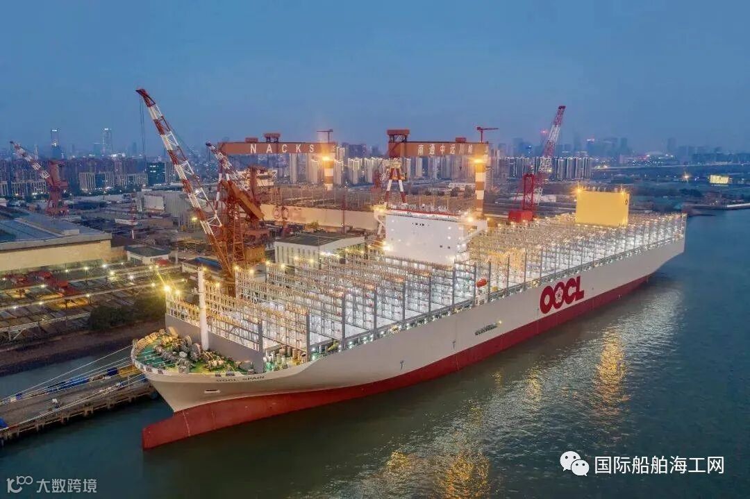 近年来,中远海运重工深入贯彻落实关于“绿色、低碳、智能”航运业发展新趋势重要论述,完整、准确、全面贯彻新发展理念,在绿色造船上下功夫,中远海运重工所属南通中远海运川崎发挥智能制造优势,深耕绿色集装箱船舶,此次交付的24188标箱超大型集装箱船“OOCL SPAIN”轮融合了南通中远海运川崎在集装箱船领域最新研发成果及智能化手段,具有安全、节能、环保、载箱量大、智能化程度高等技术优势,为国家高技术船舶名录产品和江苏省重大科技成果转化项目,全球只有极少数船厂具有该船型的设计建造能力。该船长399.99米,型宽61.3米,型深33.2米,载重量达22.8万吨,甲板面积相当于3.5个标准足球场,可一次装下24188个标准集装箱,是目前世界上尺度最大的船舶之一,堪称中国自主研发设计的新一代高性能超大型集装箱船的杰出代表。