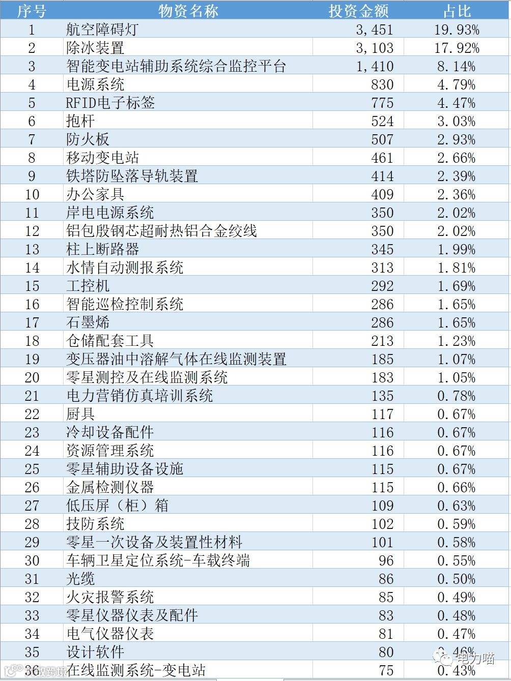 国网四川2022年第五次物资招标项目共招标了65种物资,从各物资投资力度角度,结合中标金额,航空障碍灯物资投资力度最大,合计3,451万元,占比约20%。