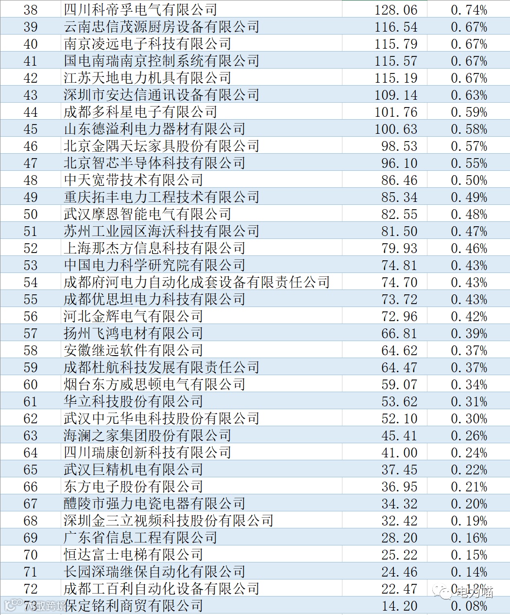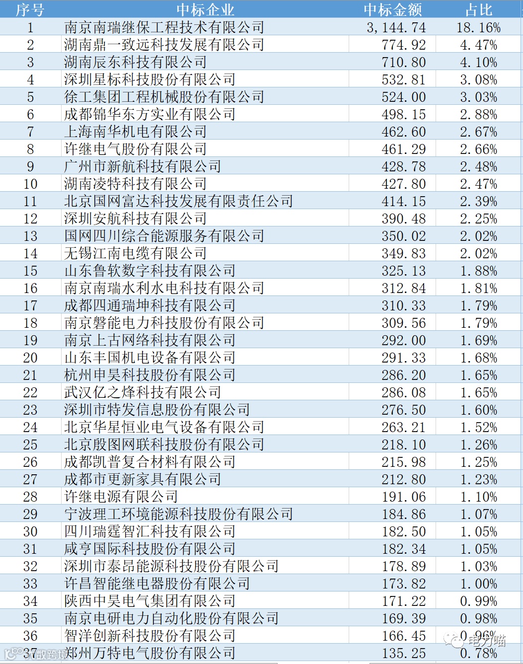 根据最终中标情况,本次项目共有73家企业中标,合计中标金额约17,318万元。单一企业中标金额最多的是南京南瑞继保工程技术有限公司,中标金额约为3,145万元,占比约18.2%。仅1家企业中标金额超过1,000万元的企业,合计金额占比18%。