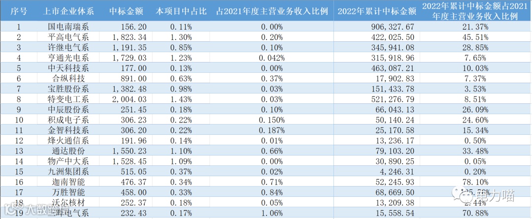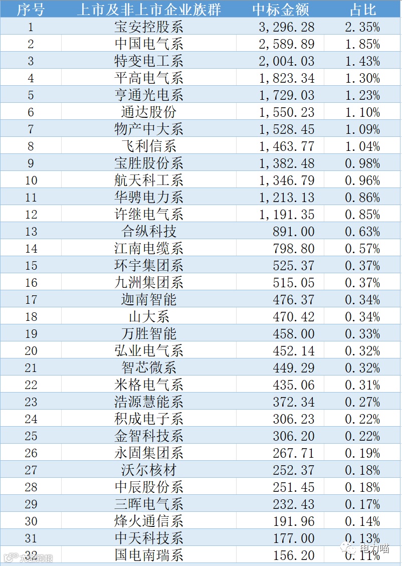 在喵喵观察的上市企业及非上市企业族群企业中,合计中标金额占比约21%。其中19个上市企业族群自身有中标或者下属公司有中标(不含非上市范围的族群企业),涵盖的企业数量有21家;另有13个非上市企业族群自身有中标或者下属公司有中标(不含上市公司范围的族群企业),涵盖的企业数量有16家。