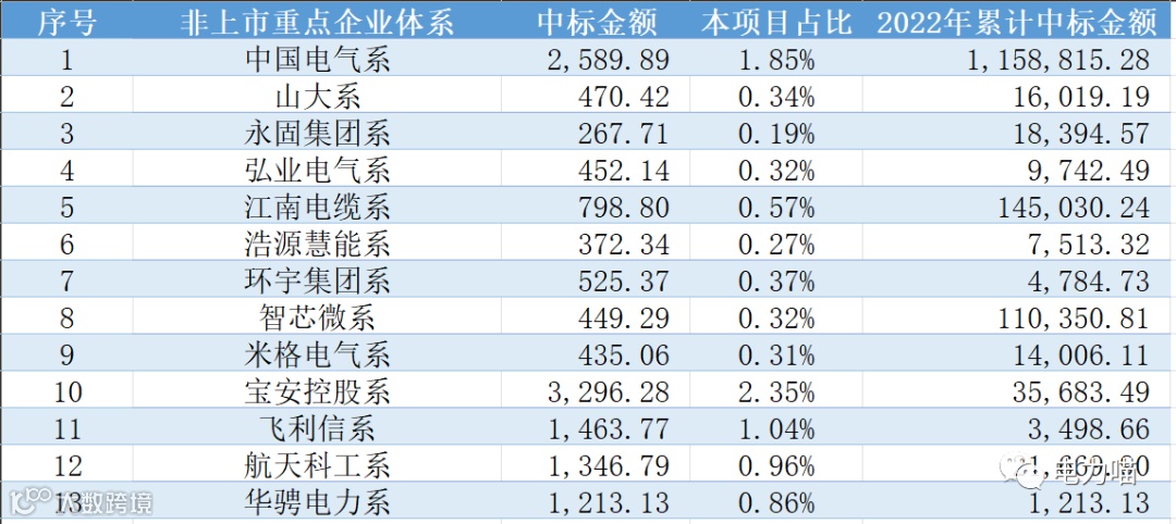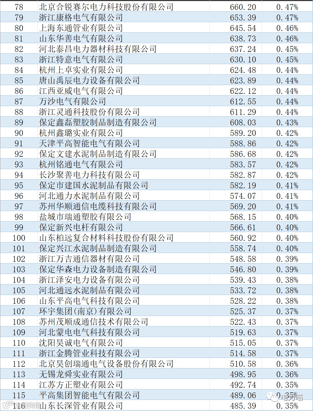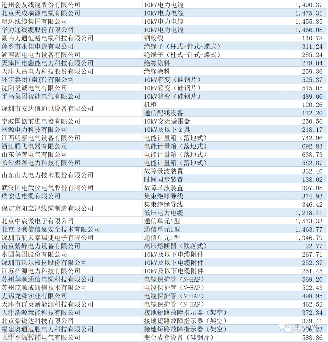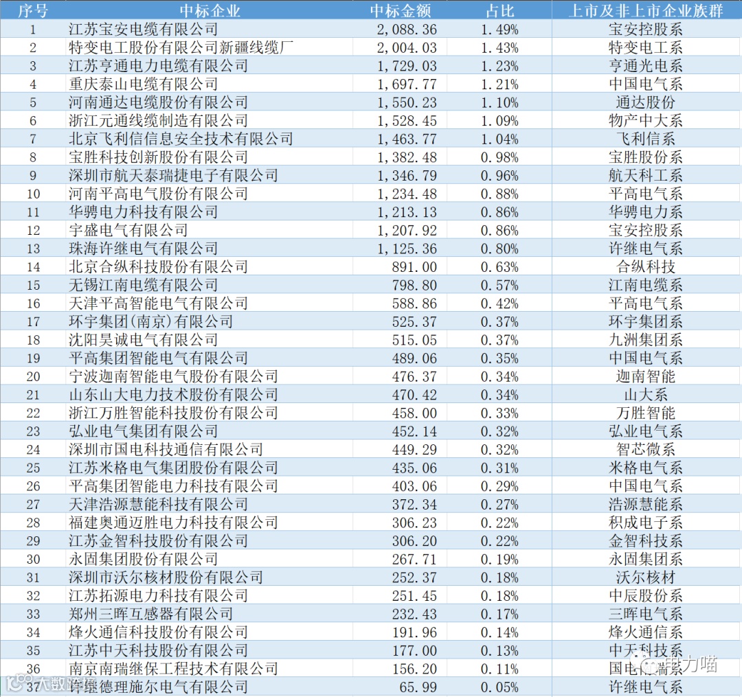 单一企业中标金额最多的是西隆电缆有限公司,中标金额约为3,757万元,占比约2.7%。共有54家企业中标金额超过1,000万元的企业,合计金额占比约61%。