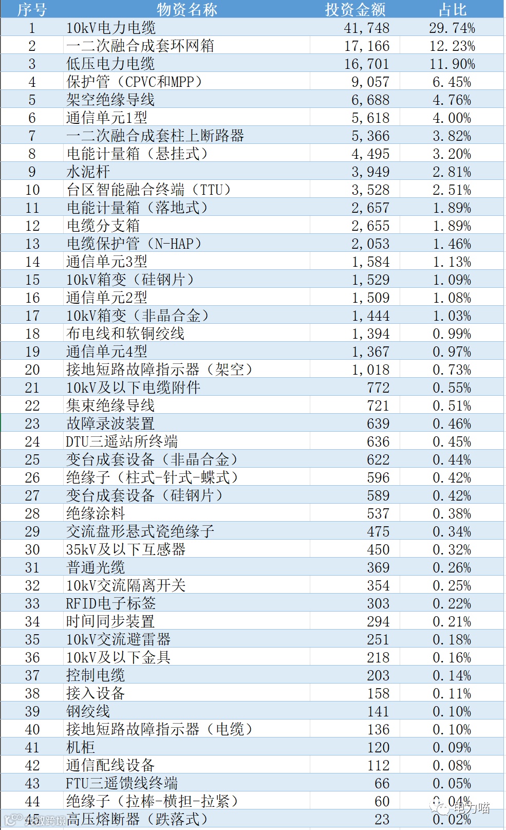 国网天津2022年第二次配网物资协议库存招标项目共招标了46种物资,从各物资投资力度角度,结合中标金额,10kV电力电缆物资投资力度最大,合计41,748万元,占比约30%。